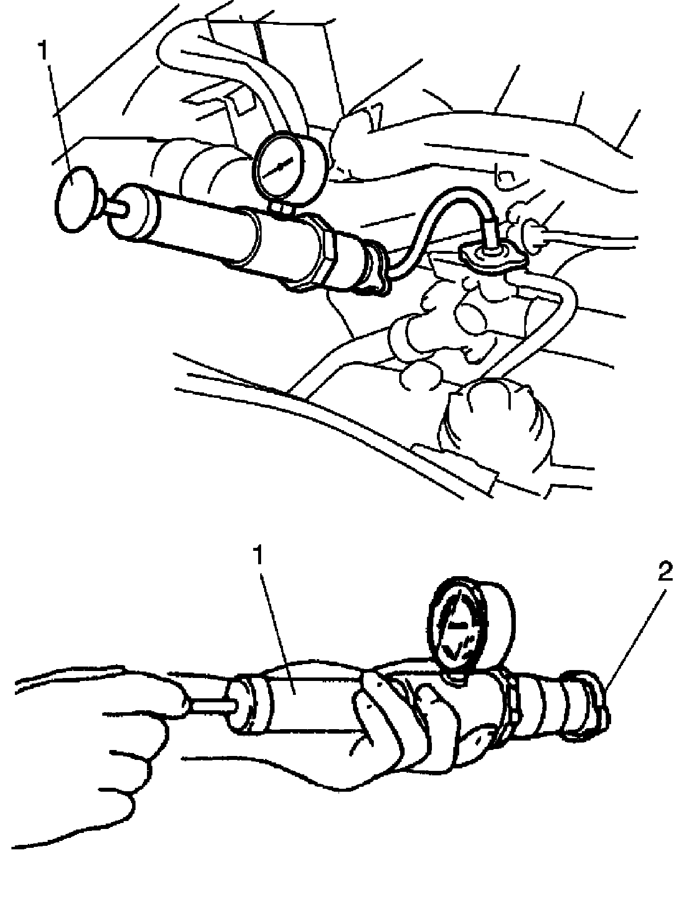 4. Using a pressure tester (1), check system and radiator cap (2) for proper pressure holding capacity.
