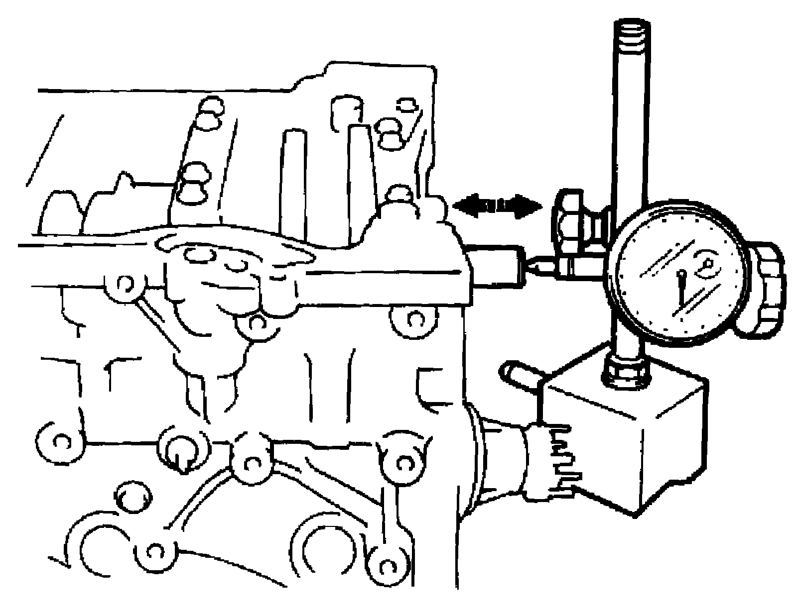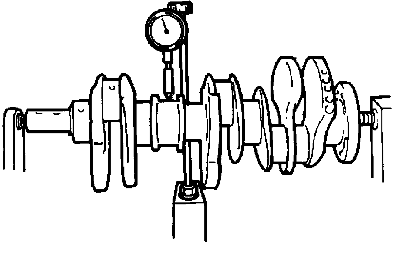Use a dial gauge to read displacement in axial (thrust) direction of crankshaft.