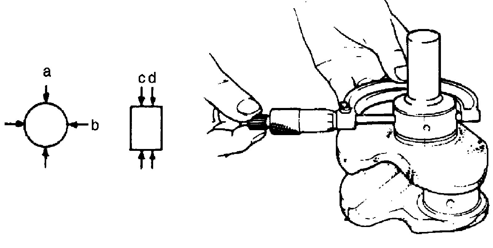 An unevenly worn crankshaft journal shows up as a difference in diameter at a cross section or along its length (or both). This difference, if any, is determined by taking micrometer readings. If any one of journals is badly damaged or if amount of uneven wear in the sense explained above exceeds its limit, regrind or replace crankshaft.