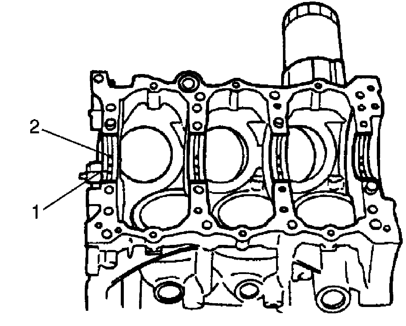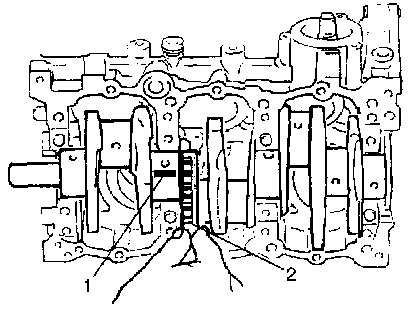 ^ Upper half of bearing (1) has oil groove (2) as shown in figure. Install this half with oil groove toward cylinder block.