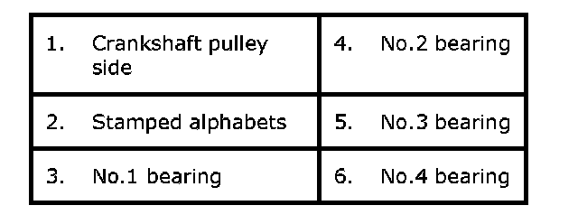 4. From number stamped on crank webs at its center and alphabets stamped on cylinder block lower side, determine new standard bearing to be installed to journal referring to cross reference table below.