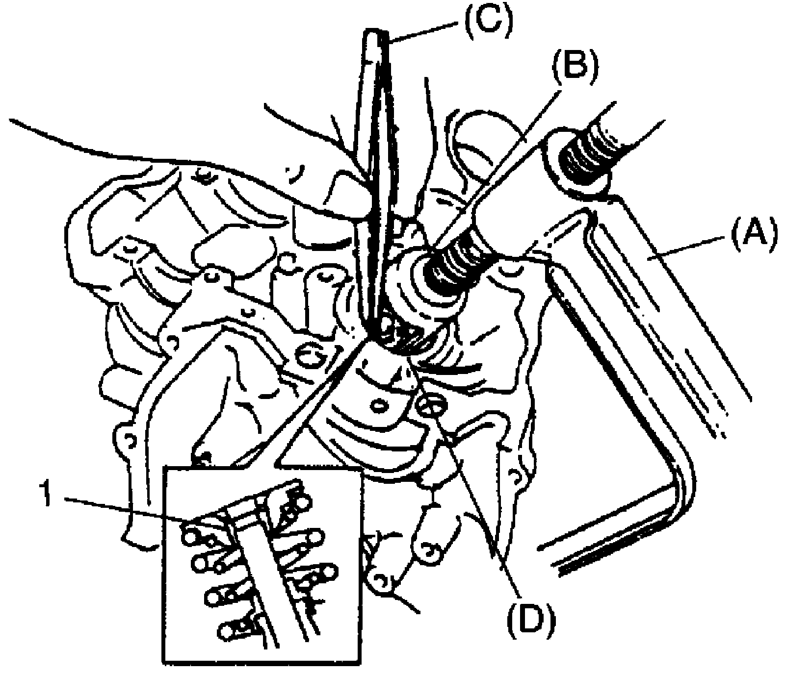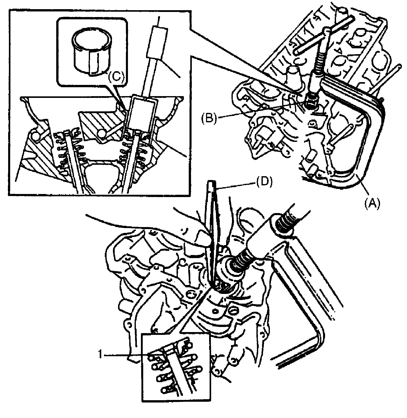 1. Using special tools (A), (B) and (C), compress valve springs and then remove valve cotters (1) by using special tool (D).