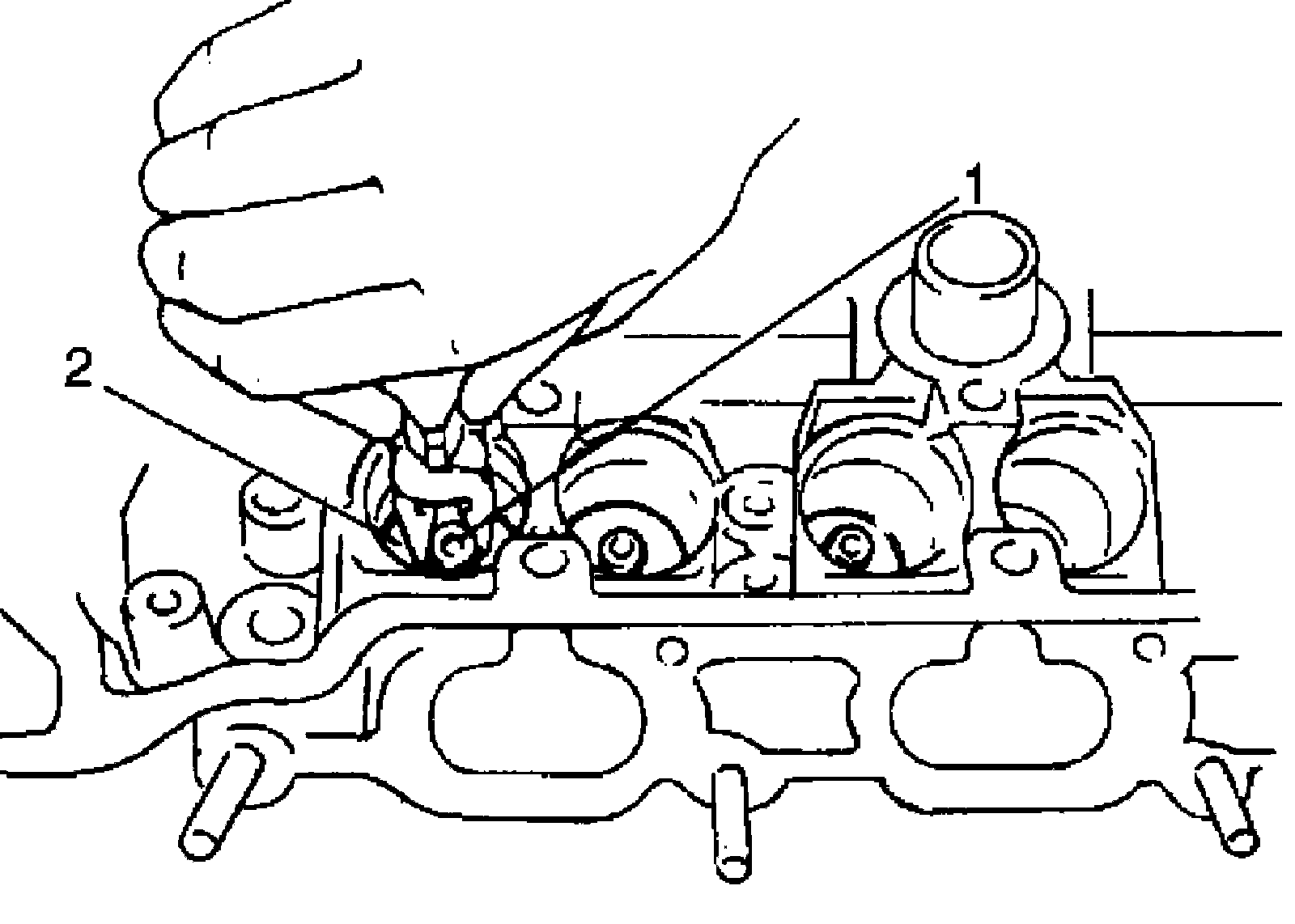 4. Remove valve stem seal (1) from valve guide, and then valve spring seat (2).