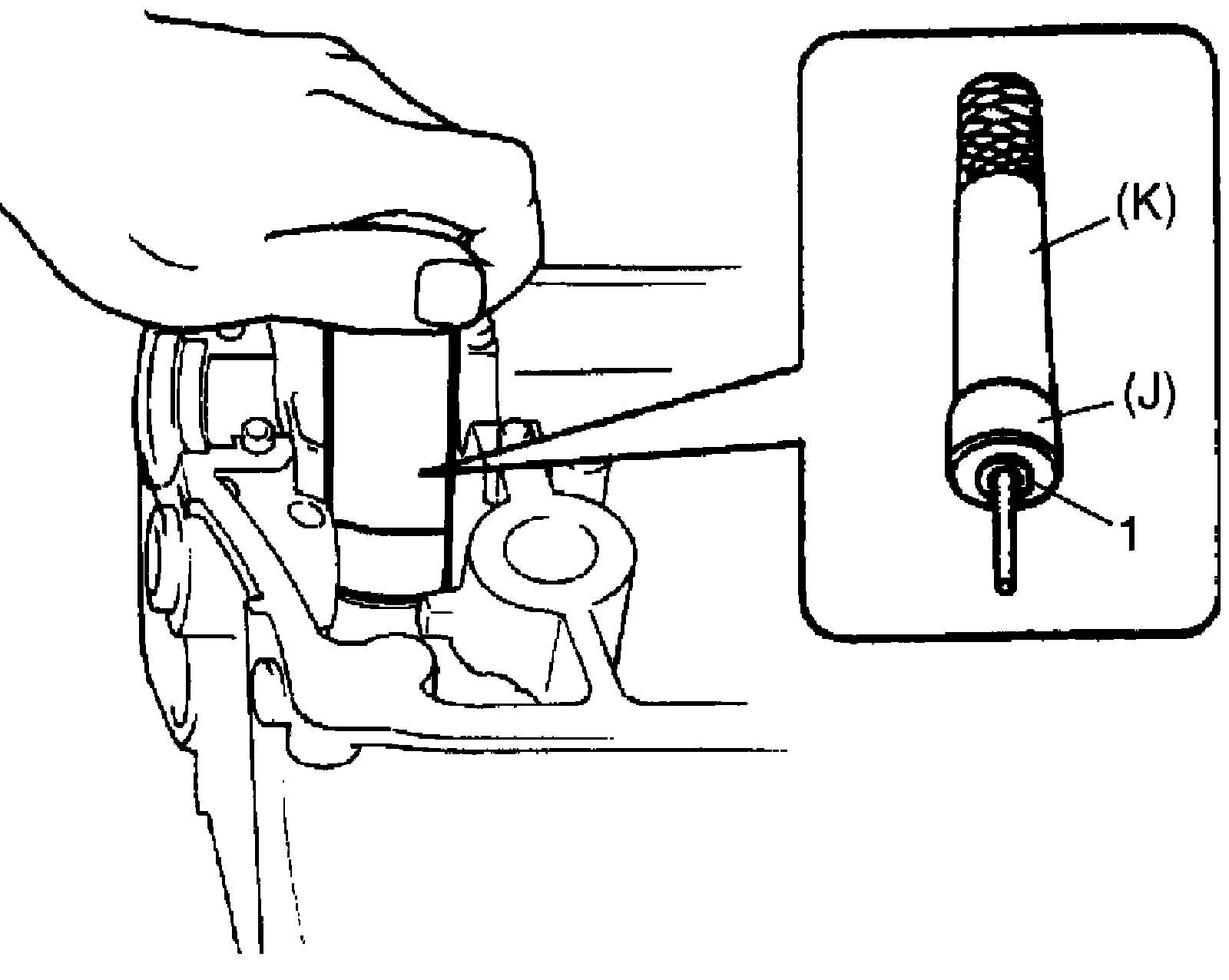 8. Using special tool (Valve lifter), compress valve spring and fit 2 valve cotters (1) into groove in valve stem.
