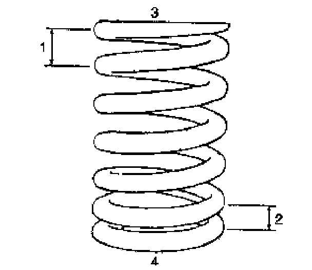 Each valve spring has top end (large-pitch end (1)) and bottom end (small-pitch end (2)). Be sure to position spring in place with its bottom end (valve spring retainer side (3)) facing the bottom (valve spring seat side (4)).