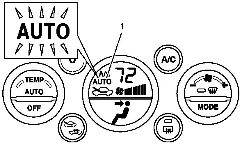 When HVAC control module detects malfunction, the "AUTO" display (1) flashes to warn and the diagnostic trouble code (DTC) is stored in the memory of the module. When diagnosing trouble, the DTC can be checked according to DTC Check.