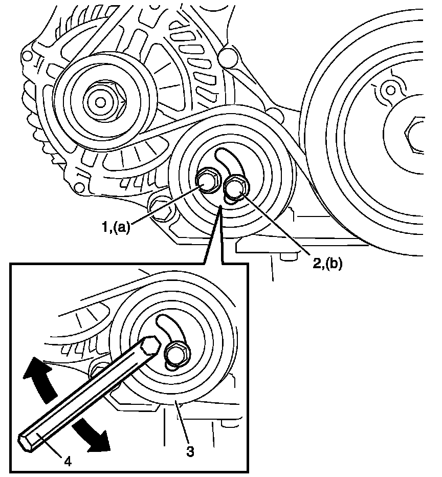a. Loosen adjusting bolt (2) and remove tension pulley bolt (1). And then turn tension pulley (3) using hexagon wrench (4) as shown.