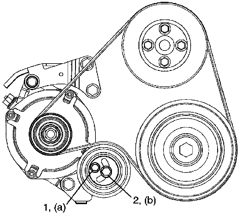 b. Adjust belt tension to specification, and then tighten adjusting bolt (2) and tension pulley bolt (1) to specified torque.