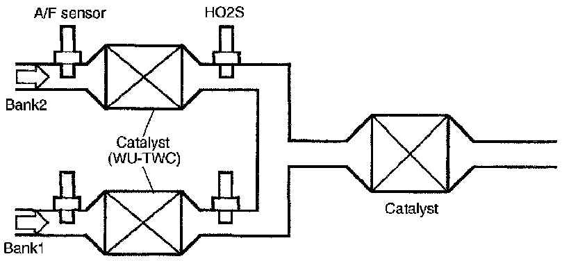 The system has 4 oxygen sensors located upstream and downstream of the catalysts. The layout of catalysts and oxygen sensors is described below.