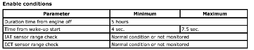 ECM monitors ECT sensor to ensure that temperature has dropped to environmental temperature. After 5 hours (using timer module) from engine stop, the system wakes up ECM and measures ECT and IAT signal. If difference between ECT and IAT is more than the criteria, ECM will set DTC.