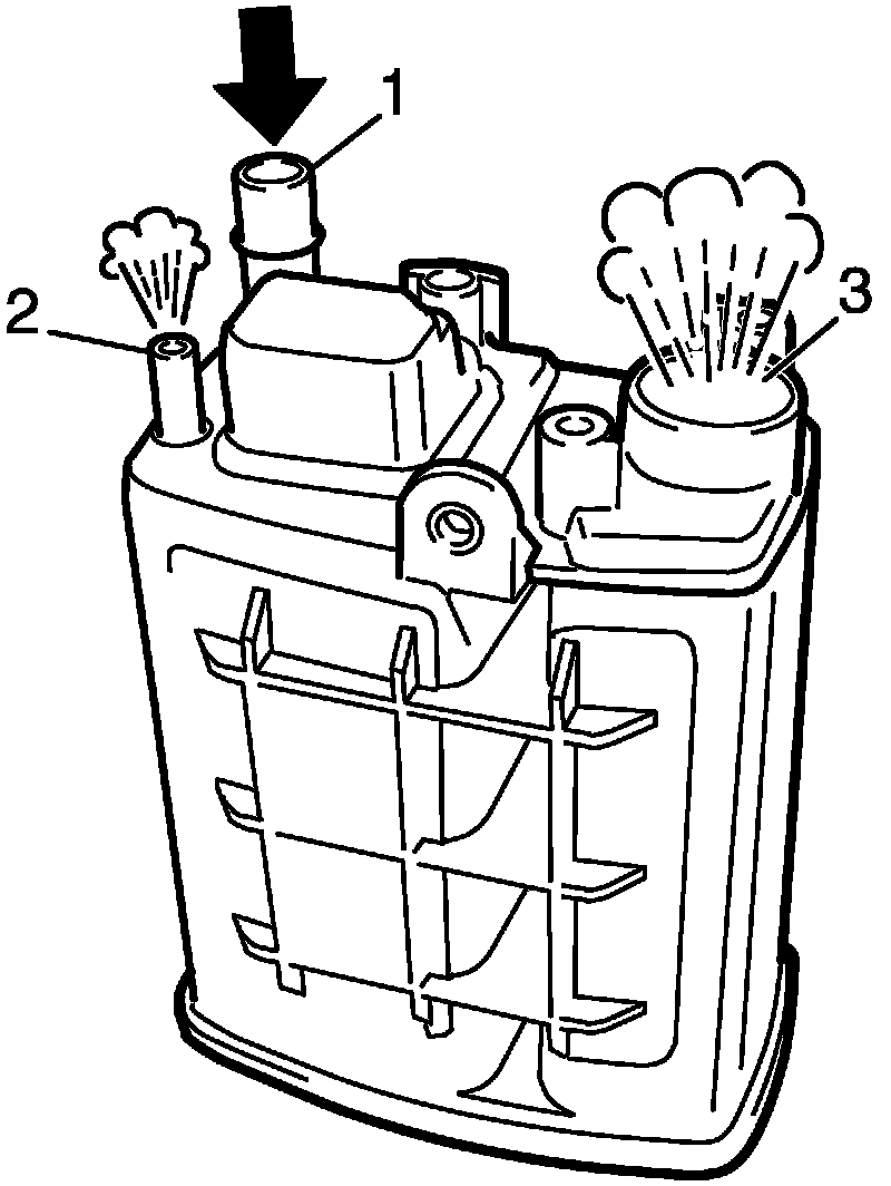 When air is blown into tank pipe port (1), there should be no resistance of flow through purge pipe port (2) and EVAP leak check module port (3). If any abnormality is found, replace EVAP canister.