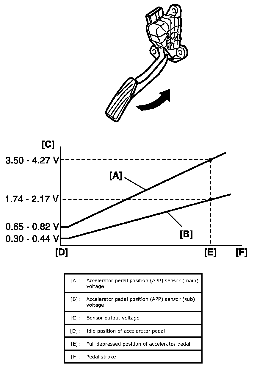 4. Check that accelerator pedal position sensor voltage varies as the following graph. If sensor voltage is out of specified value or does not vary linearly as the following graph, check accelerator pedal position (APP) sensor assembly referring to Accelerator Pedal Position (APP) Sensor Assembly Inspection.