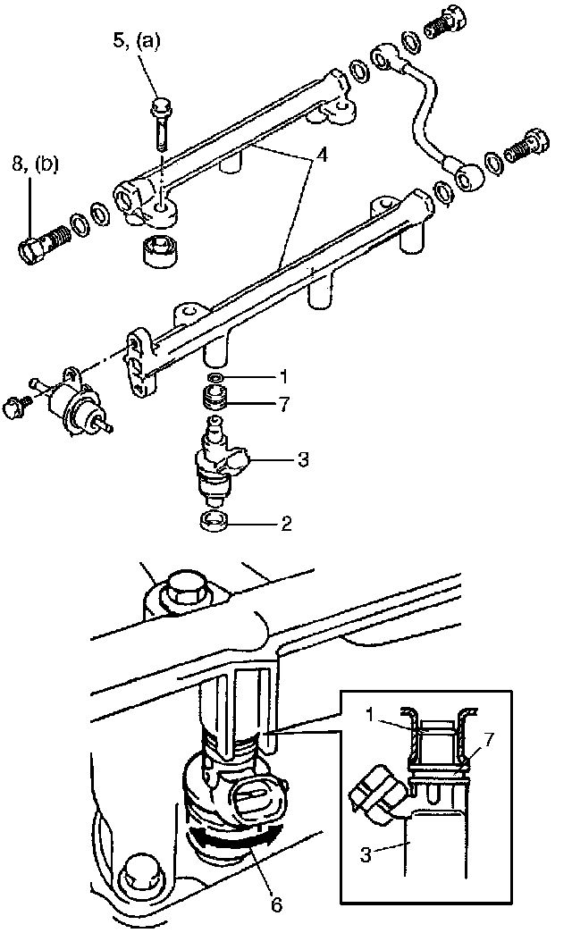 - Tighten delivery pipe bolts (5) and fuel union bolt (8) to specified torque and make sure that injectors rotate smoothly.