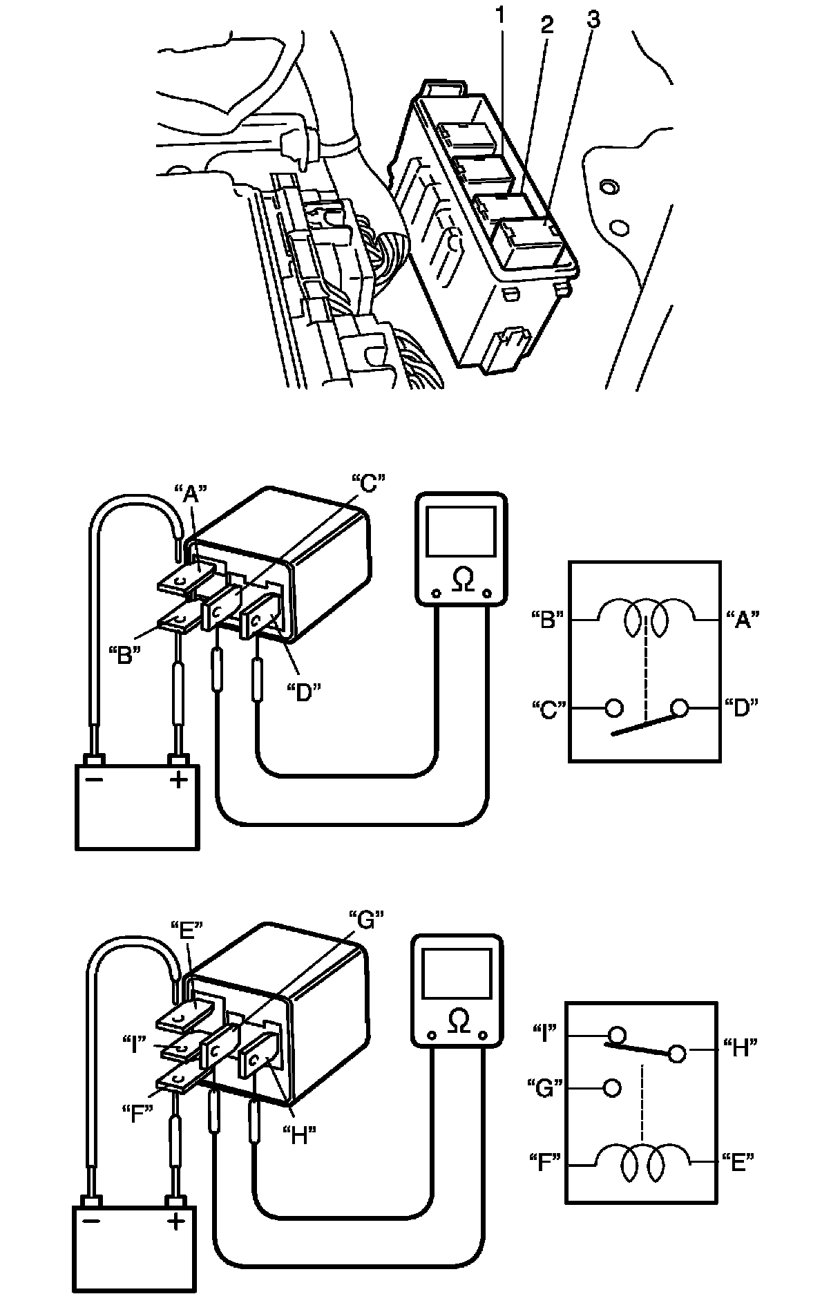 e) Check continuity between terminals "G" and "H". If there is no continuity, replace relay.