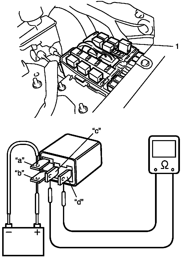 3. Check that there is no continuity between terminal "c" and "d". If there is continuity, replace relay.