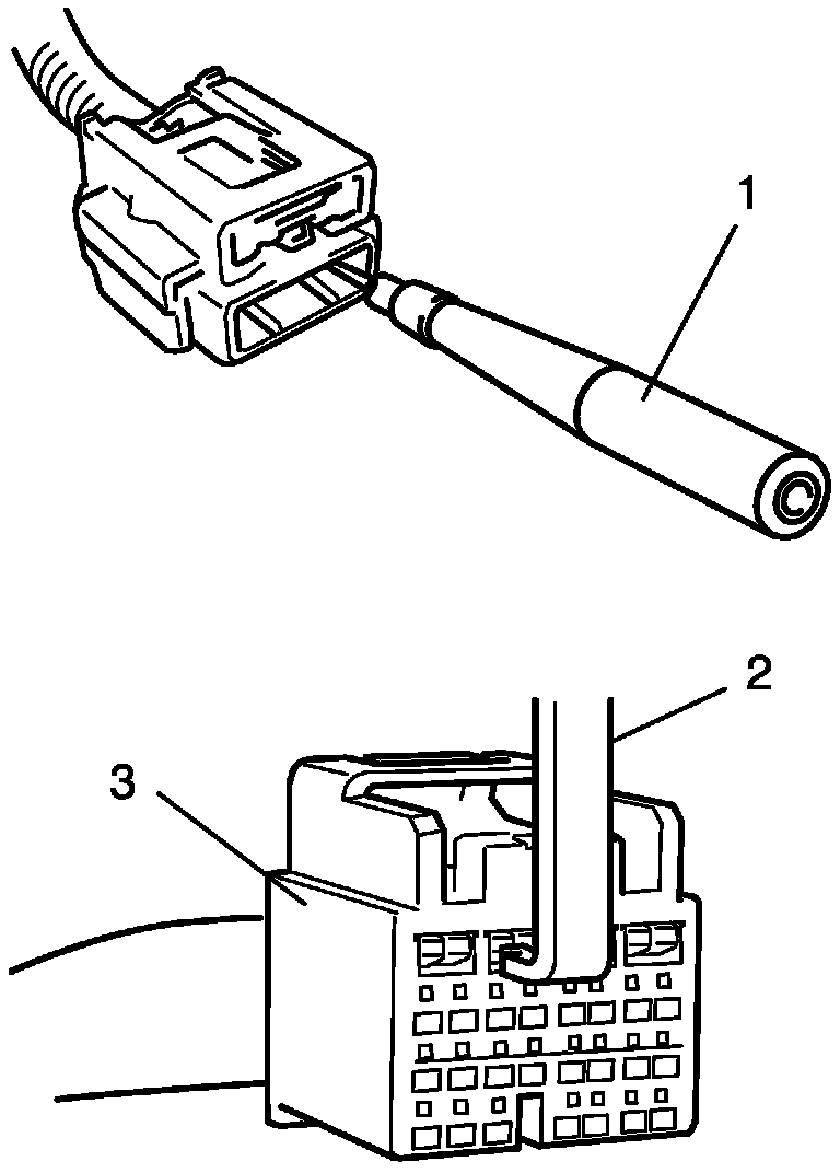 The adapter (1) will also give an idea of whether or not contact tension is sufficient, helping to find an open or intermittent open due to poor terminal contact. An SDM short bar release tool (2) is included in the connector test adapter kit. Inserting it into the SDM connector (3) will releases the shorting bar.