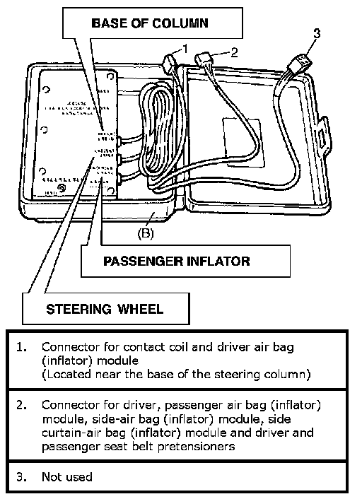 Another connector ("BASE OF COLUMN") is used to substitute the load of the driver air bag (inflator) module and the contact coil assembly when it is connected at the base of the column to the air bag wire harness.