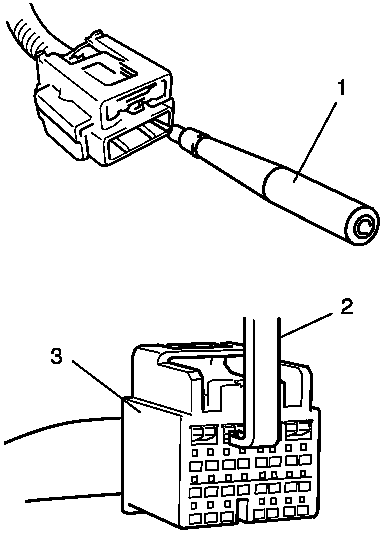 The adapter (1) will also give an idea of whether or not contact tension is sufficient, helping to find an open or intermittent open due to poor terminal contact. An SDM short bar release tool (2) is included in the connector test adapter kit. Inserting it into the SDM connector (3) will releases the shorting bar.
