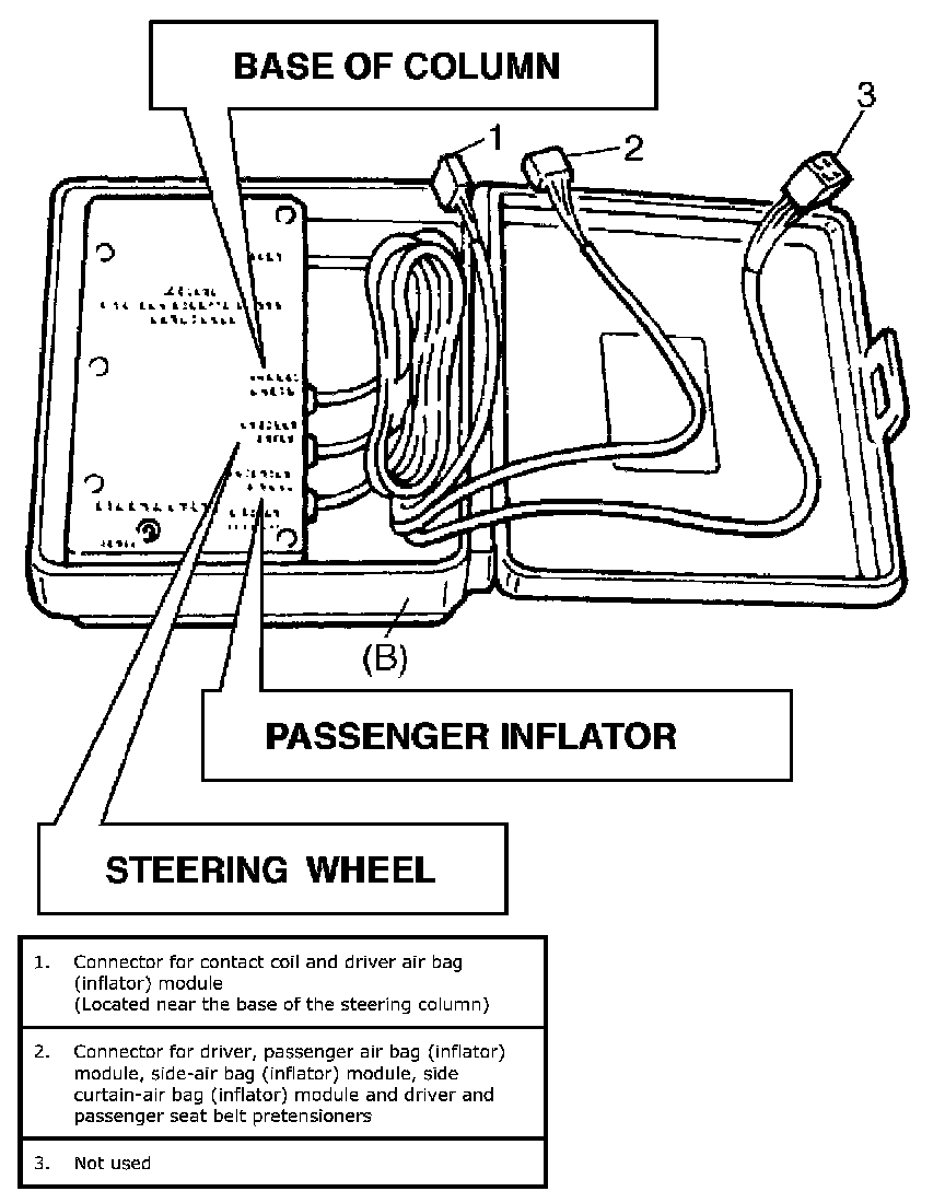 Another connector ("BASE OF COLUMN") is used to substitute the load of the driver air bag (inflator) module and the contact coil assembly when it is connected at the base of the column to the air bag wire harness.