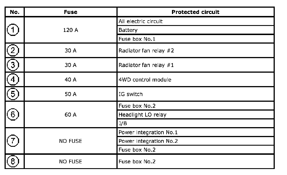 Fuse Box No.1 Application Table Fuse 1-Fuse 8: