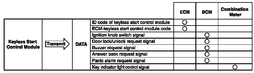 CAN Communication System DescriptionRefer to CAN Communication System Description for CAN communication system description. Keyless start control module communicates control data with each control modules as follows.