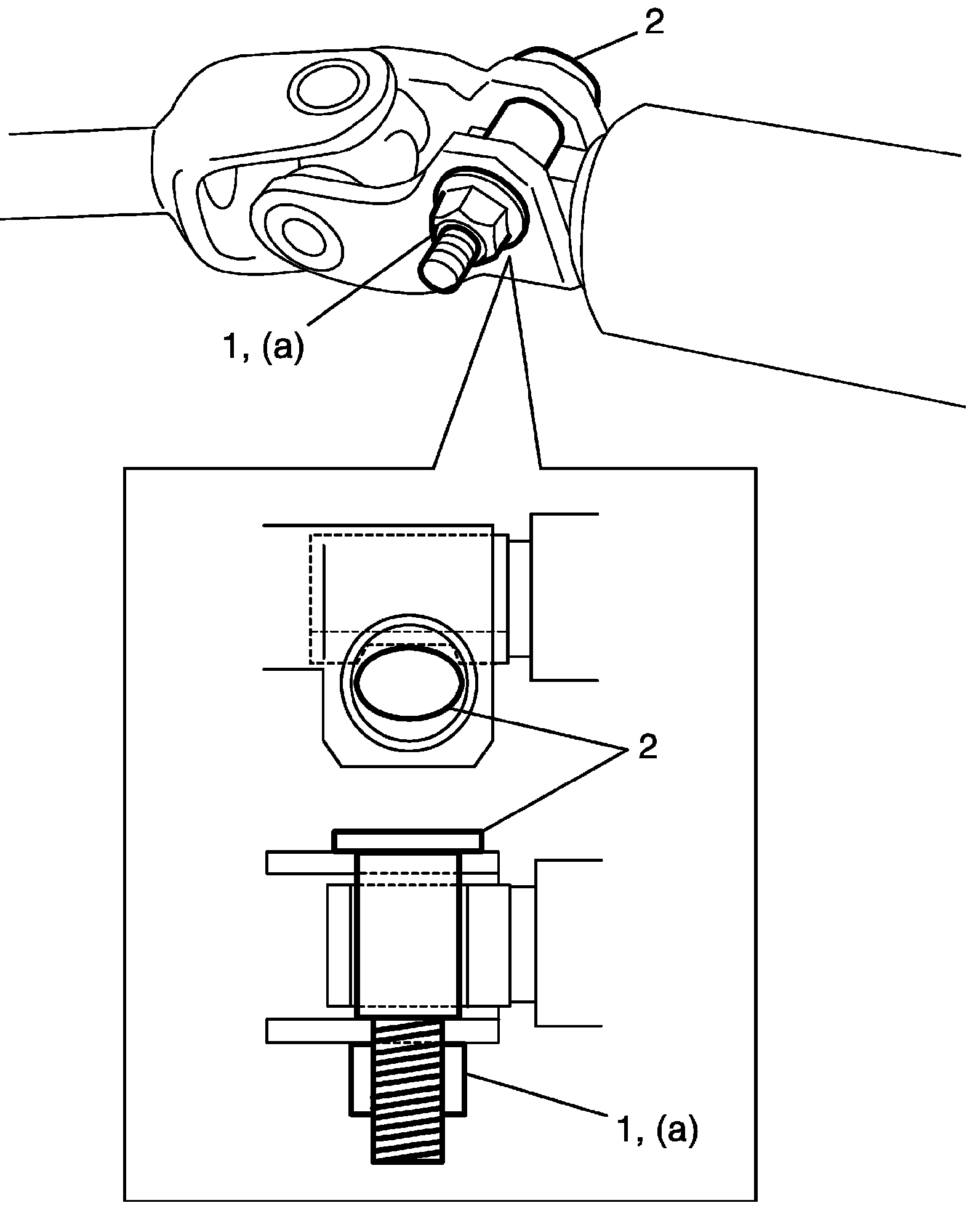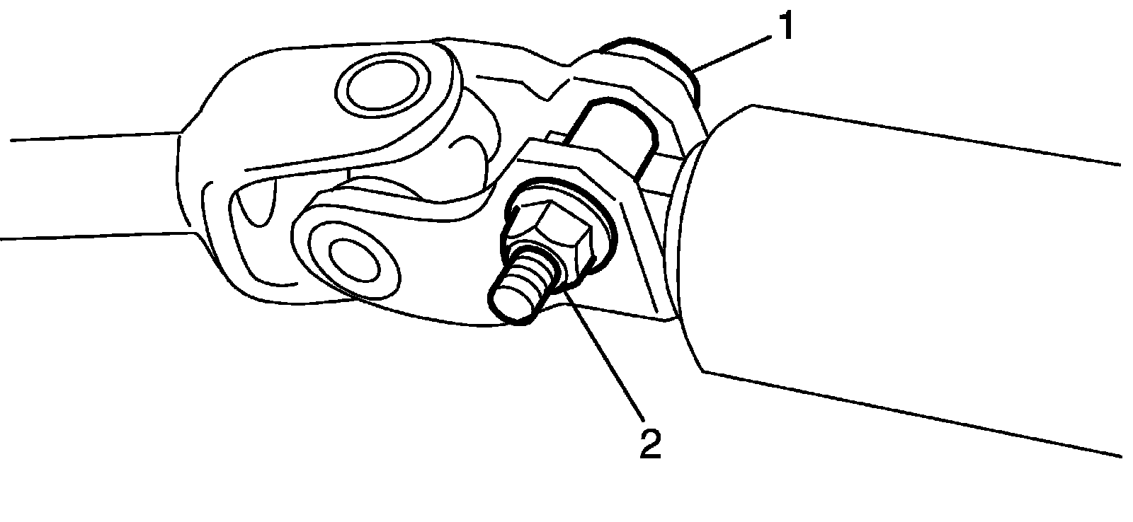5) Install new steering upper shaft upper joint bolt (2) and nut (1). Tighten new steering upper shaft upper joint nut (1) to specified torque.