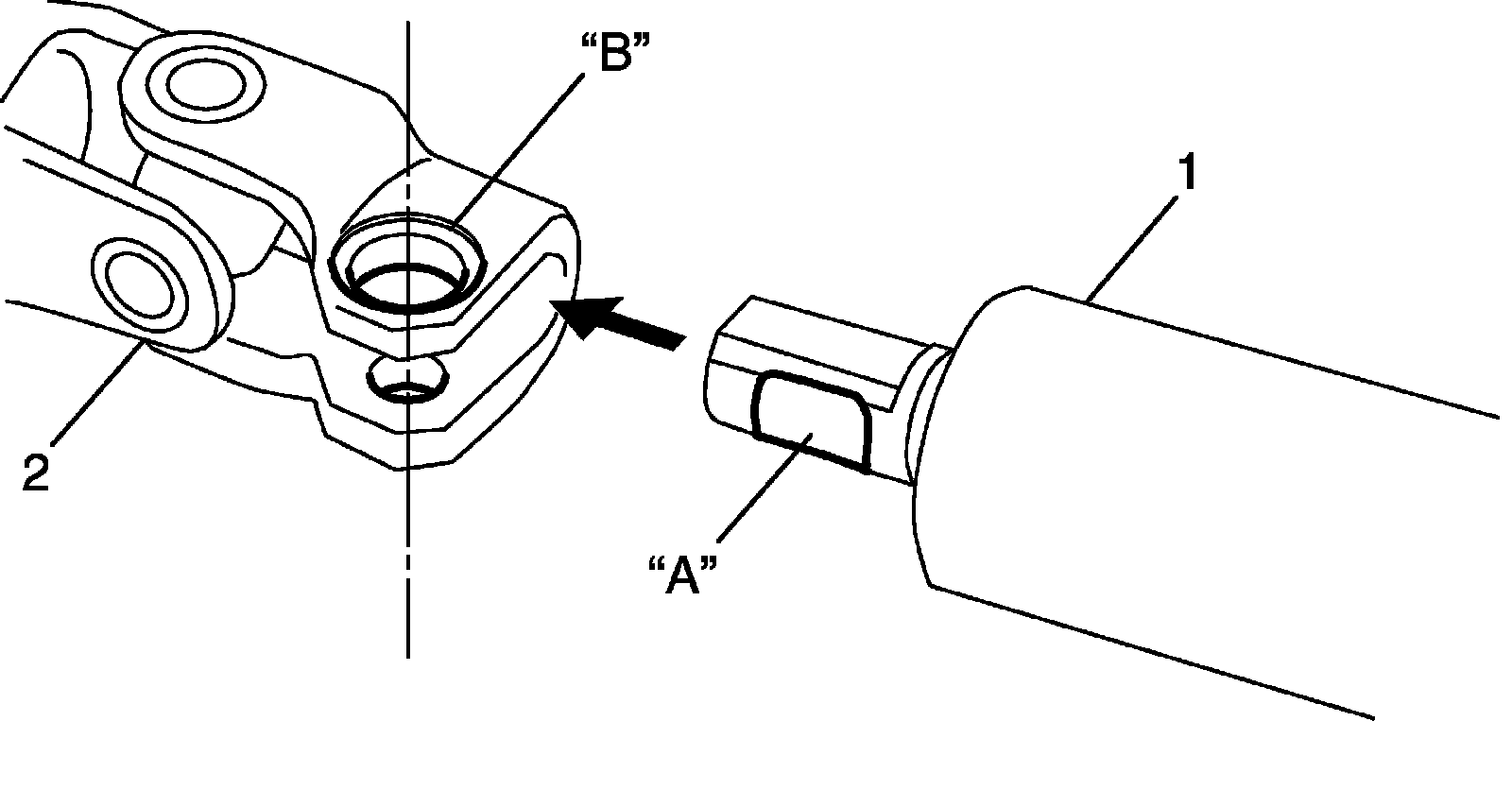 2) Align flat part "A" of steering upper shaft upper joint (1) with bolt hole "B" of steering column assembly (2) as shown in the figure. Then connect steering upper shaft upper joint.