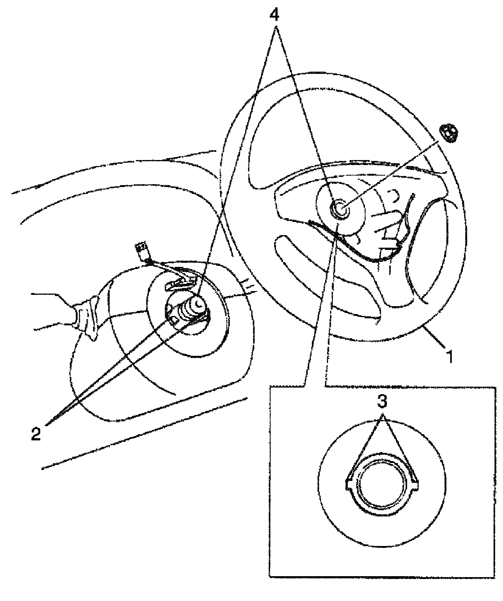 2) Install steering wheel (1) to steering shaft with 2 lugs (2) on contact coil cable assembly fitted in two grooves (3) in the back of steering wheel and also aligning marks (4) on steering wheel and steering shaft.