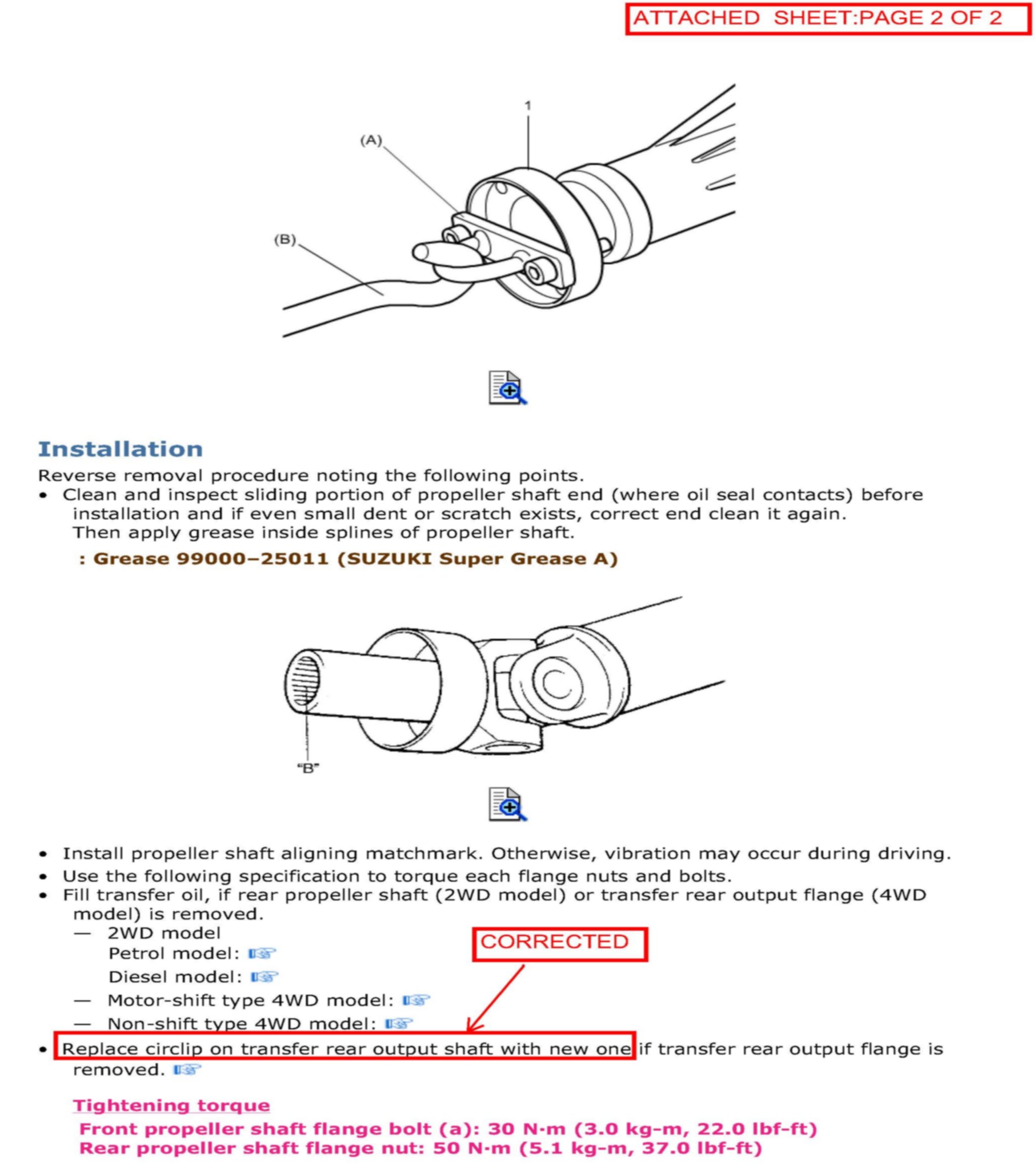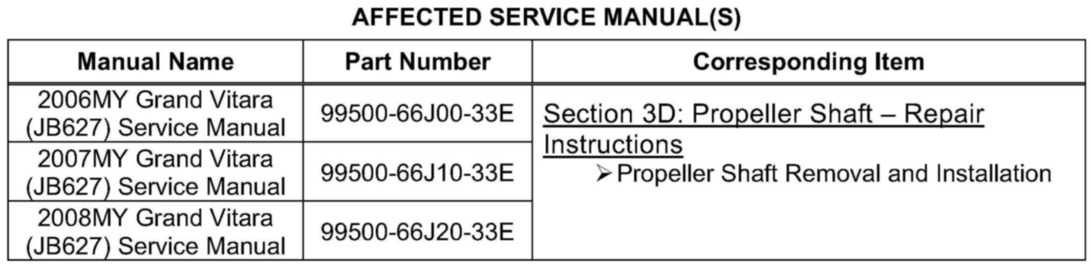 This bulletin is to inform you of the correction of "Propeller Shaft Removal and Installation" described in the following service manual for GRAND VITARA (JB424, JB627, JB632).
