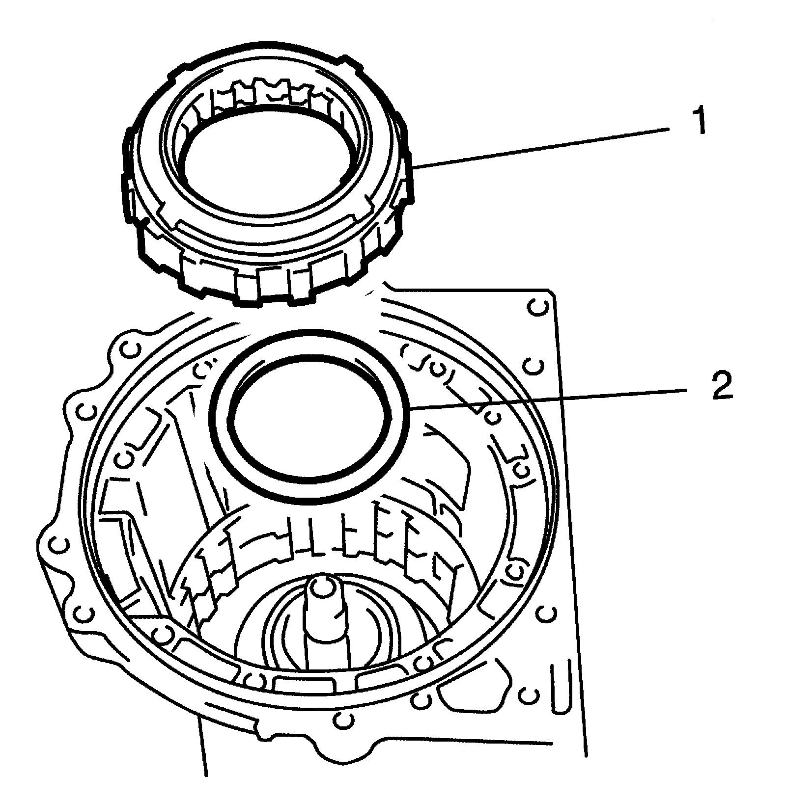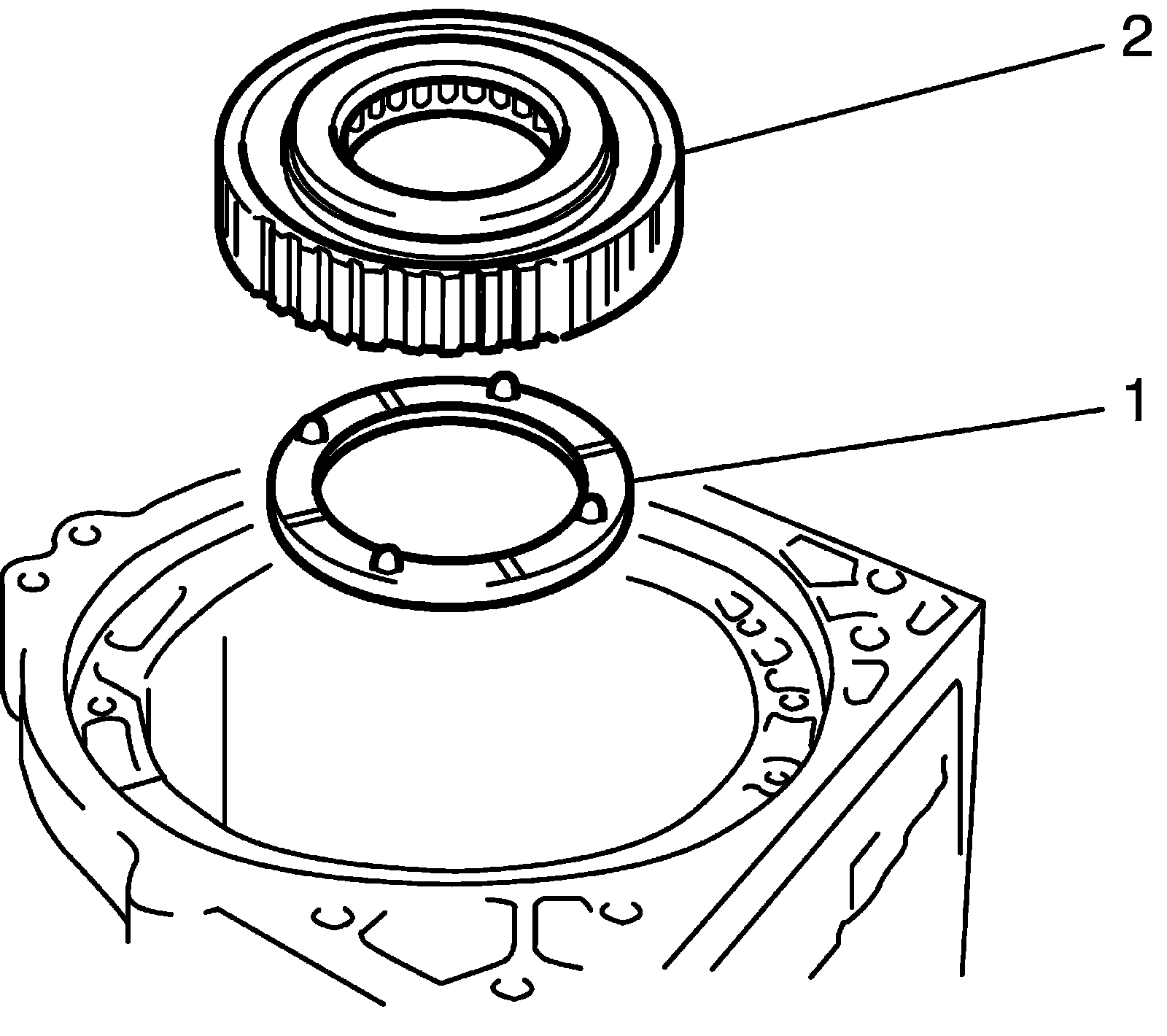 61) Install clutch hub thrust washer (1) and one-way No.2 clutch assembly (2) to transmission case.