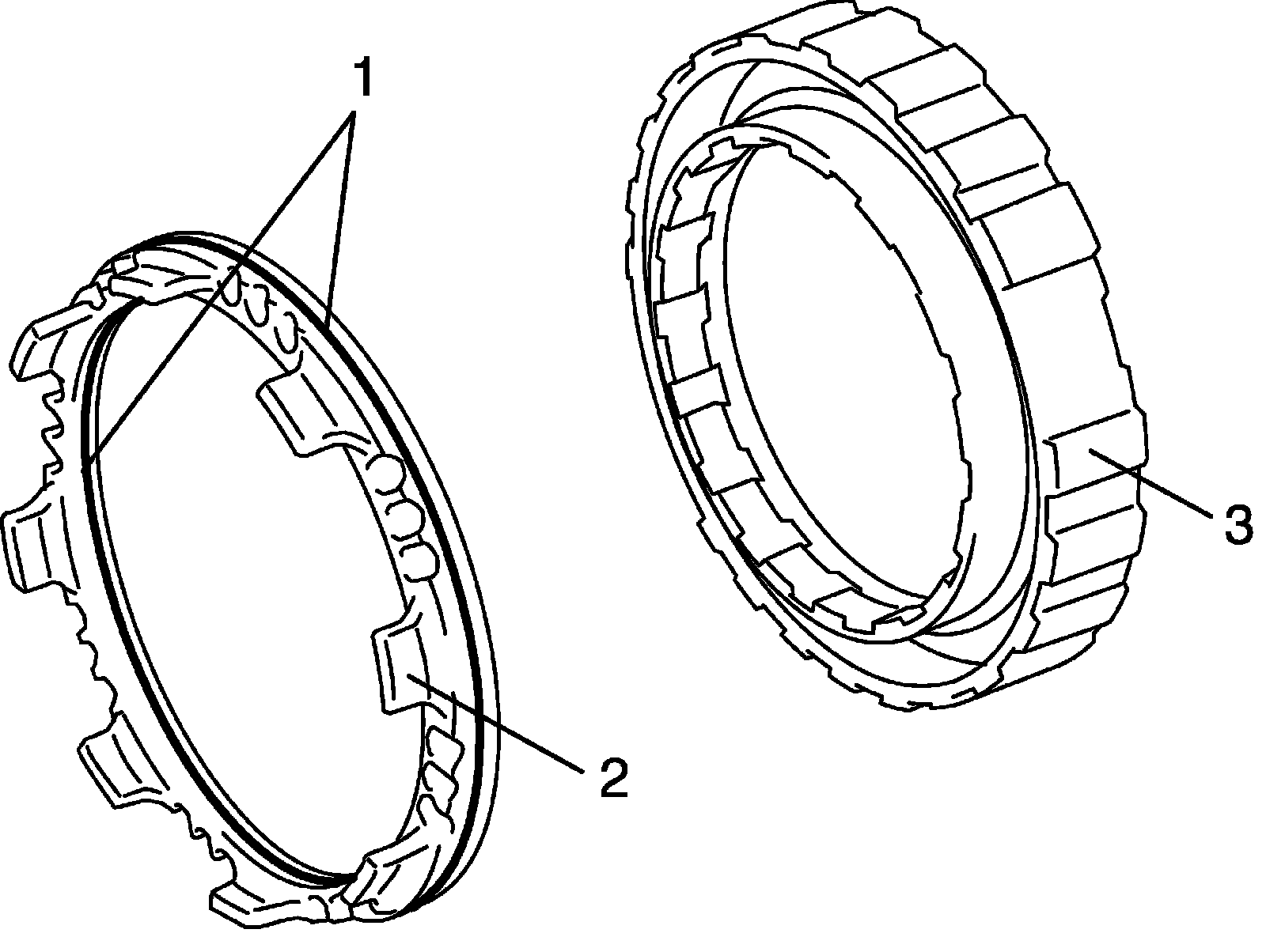 60) Fit clutch hub thrust washer (1)to one-way No.2 clutch assembly (2) with petroleum jelly so that clutch hub thrust washer (1) does not fall off.