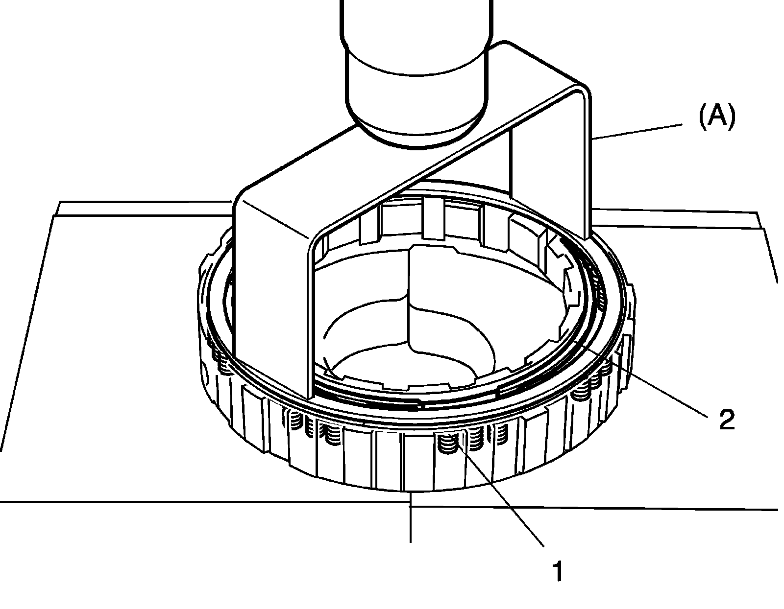 56) Compress 2nd (No.3) brake piston return spring (1) until the 2nd (No.3) brake piston return spring is lowered to the place 1 - 2 mm (0.039 - 0.078 in.) from the snap ring groove by using special tool.