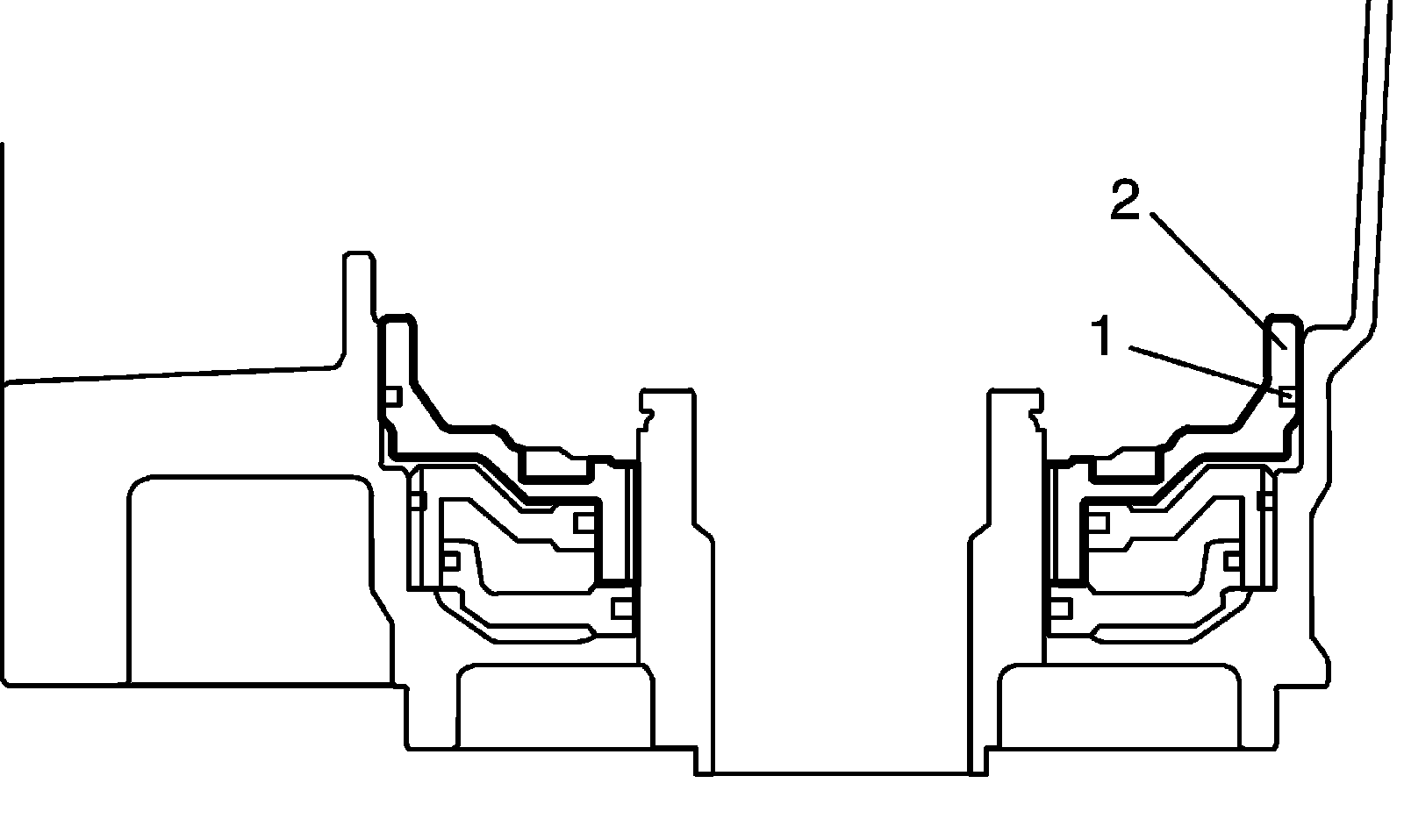 35) After applying A/T fluid to new 2 O-rings (1) and then install O-rings to No.1 brake piston (2).