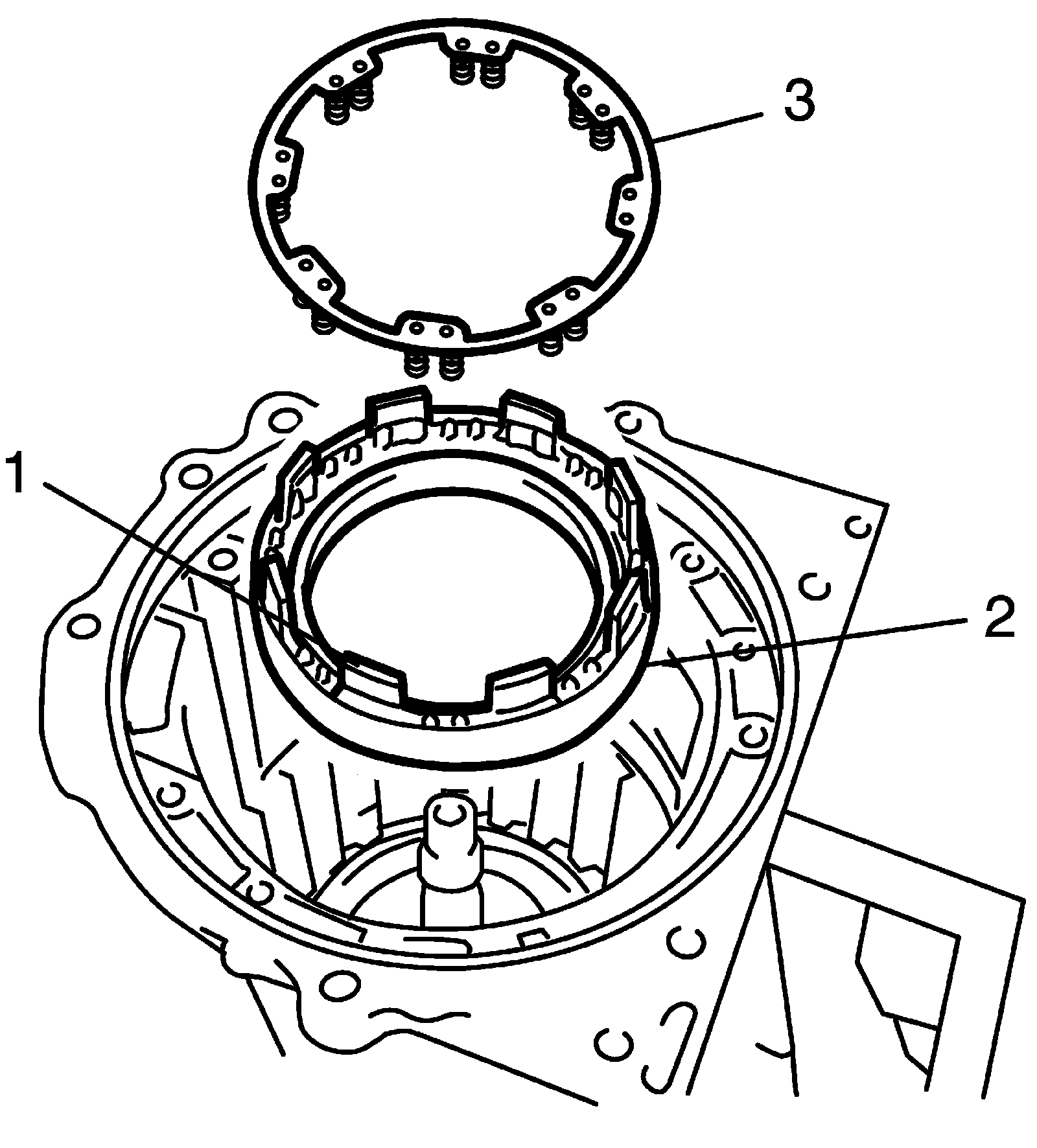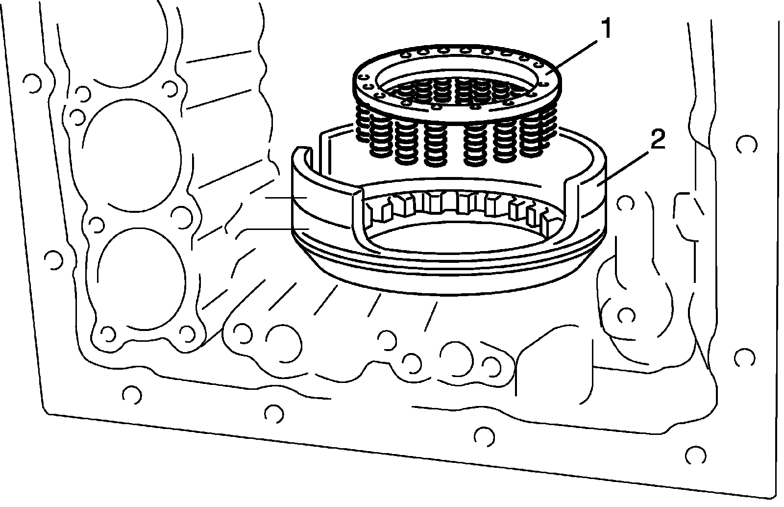 23) Install one-way No. 3 clutch assembly (1) including one-way No. 3 clutch inner race (2) to transmission case.