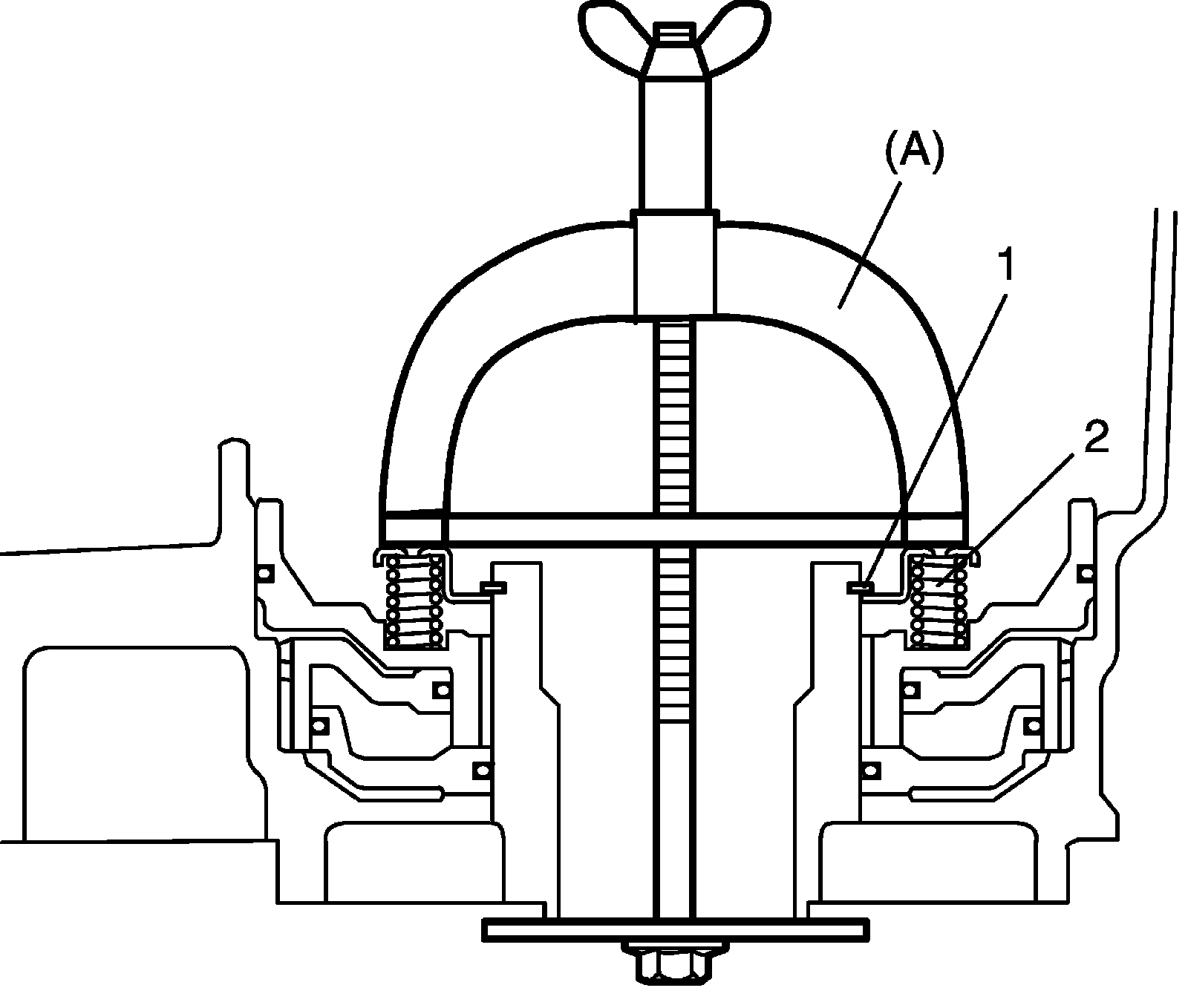 7) Place snap ring (1) on 1st & reverse (No.4) brake return spring and compress 1st & reverse (No.4) brake return spring (2) until the 1st & reverse (No.4) brake return spring is lowered to the place 1 - 2 mm (0.039 - 0.078 in.) from the snap ring groove by using special tool.