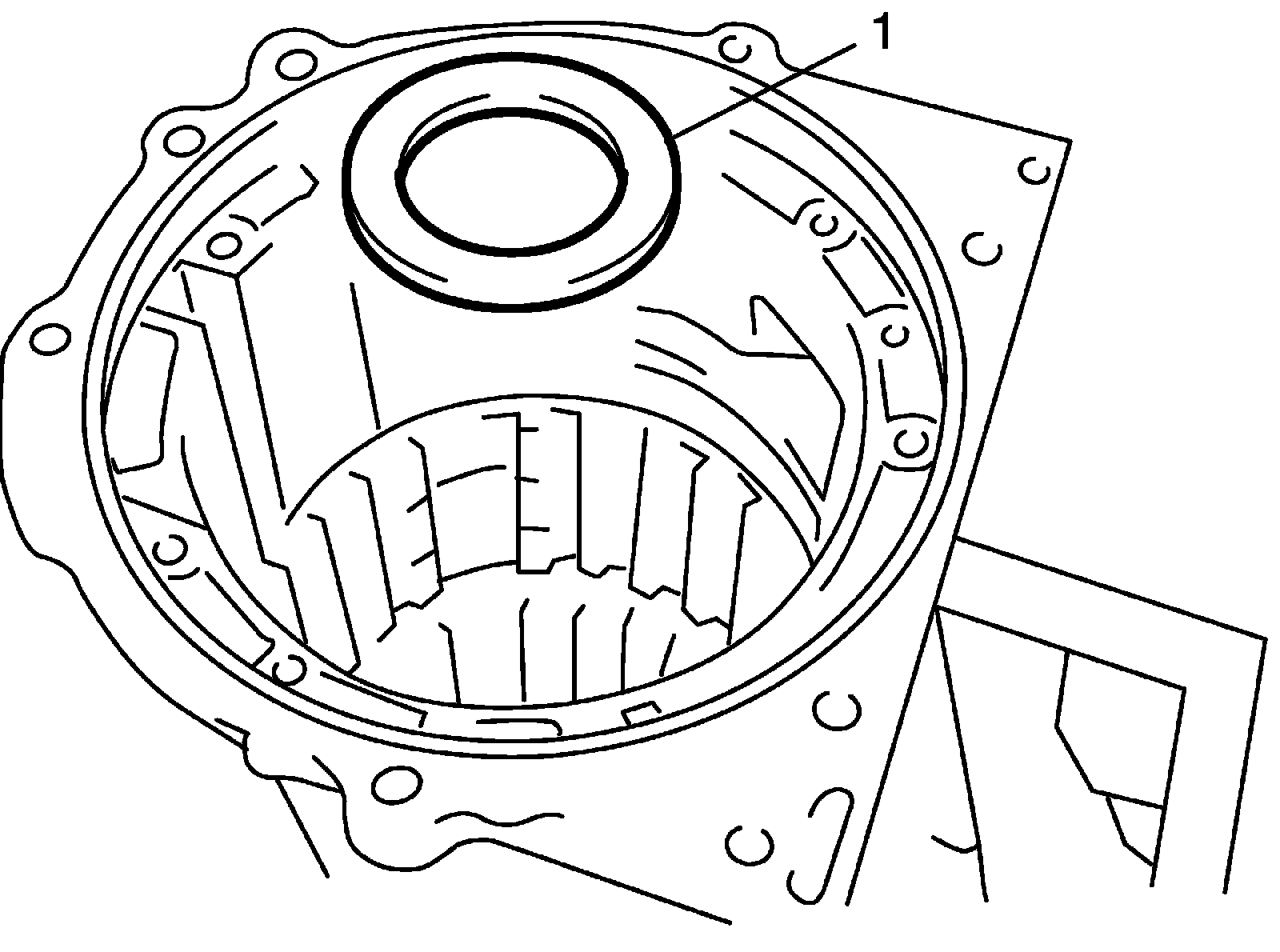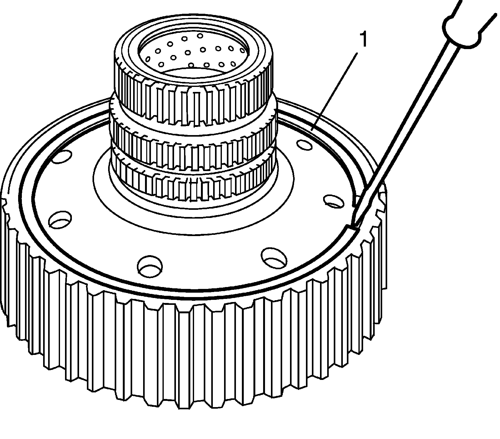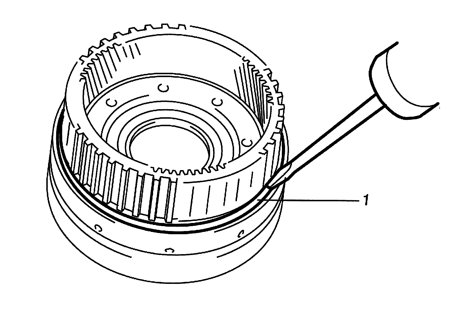24) Install snap ring (1) by using special tool being sure not to align snap ring end gap with cut portion of transmission case.
