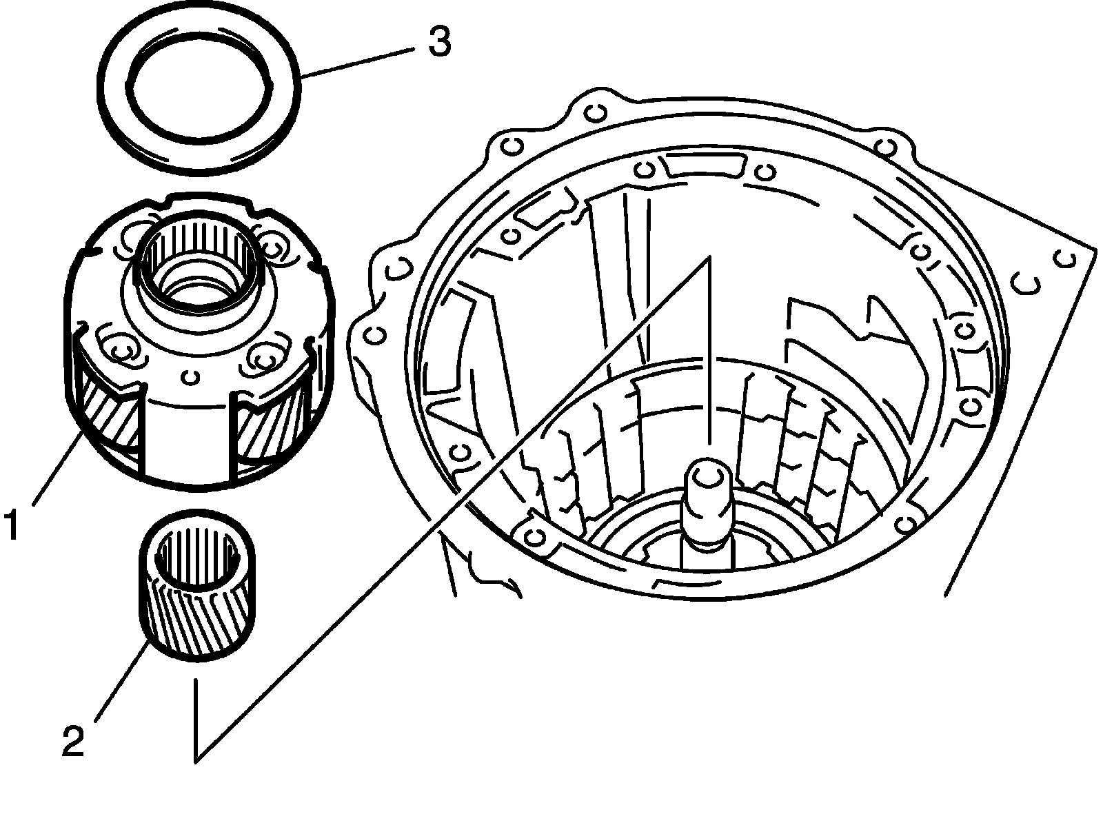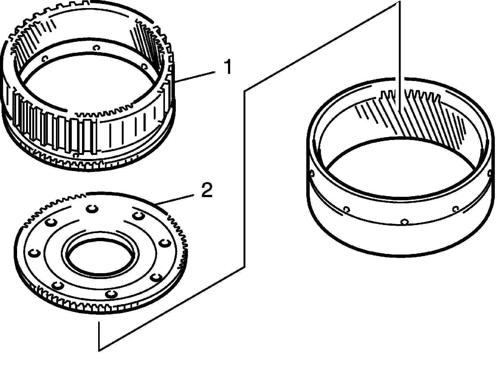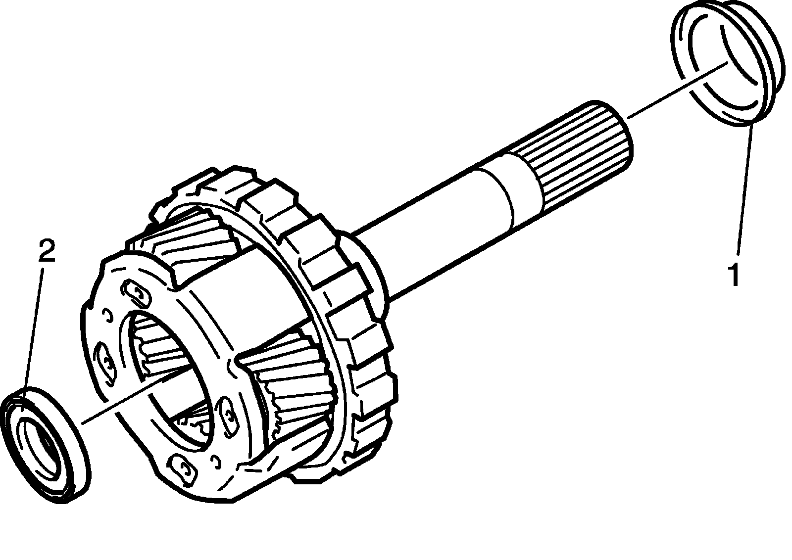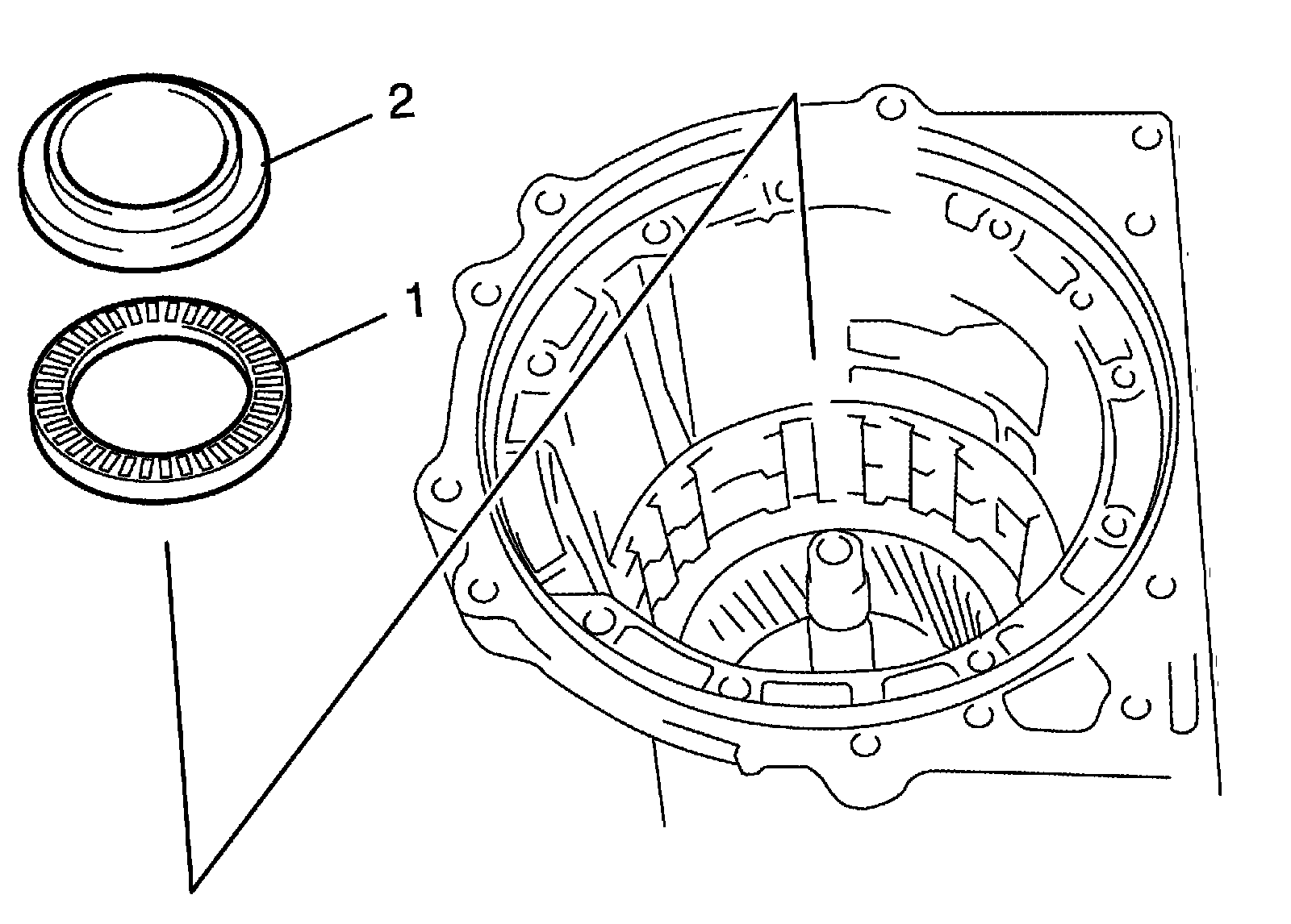 44) Install front planetary ring gear (2) and thrust needle roller bearing (1) into intermediate shaft.