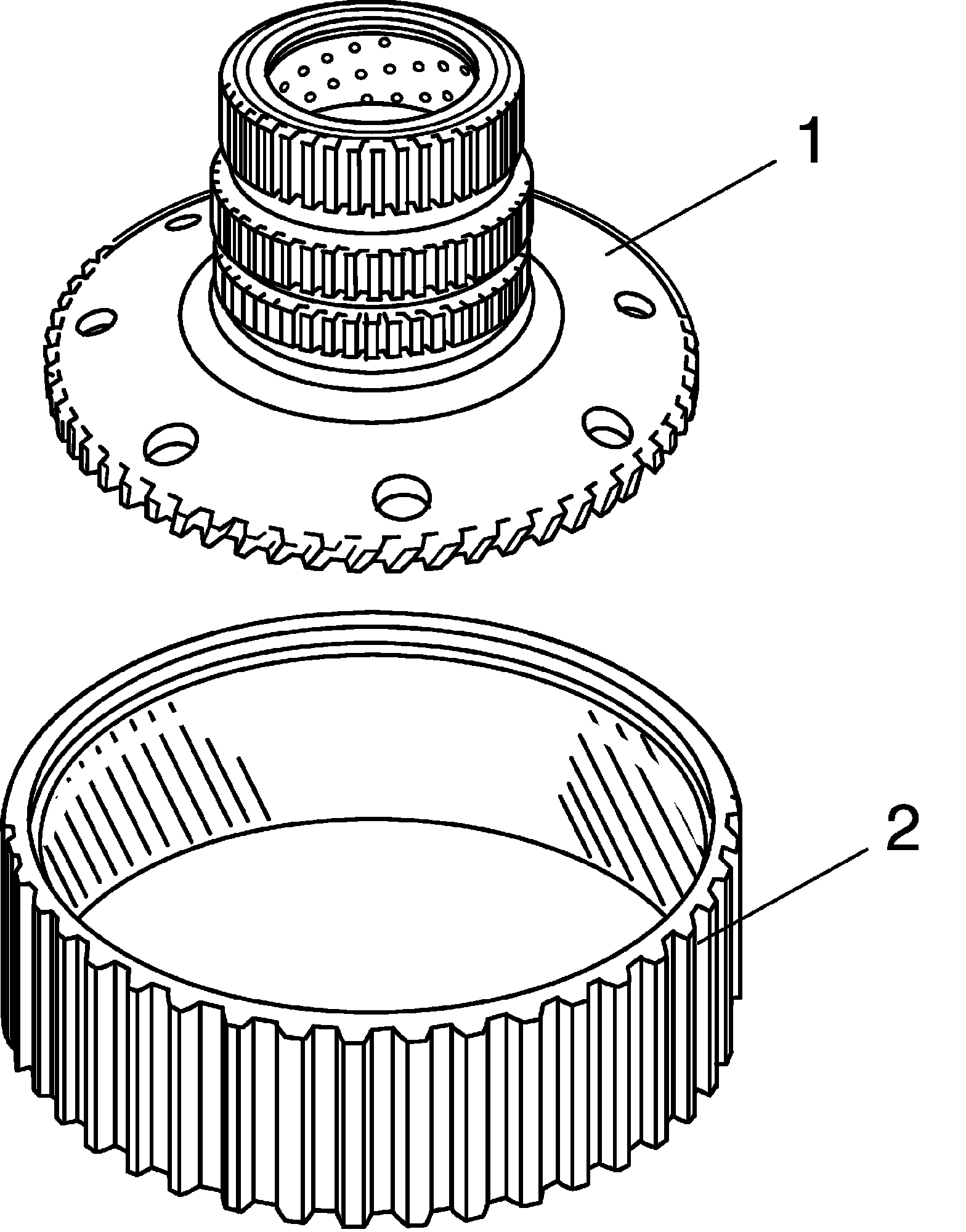 41) Install middle planetary ring gear (1) and front planetary ring gear flange (2) onto front planetary ring gear.