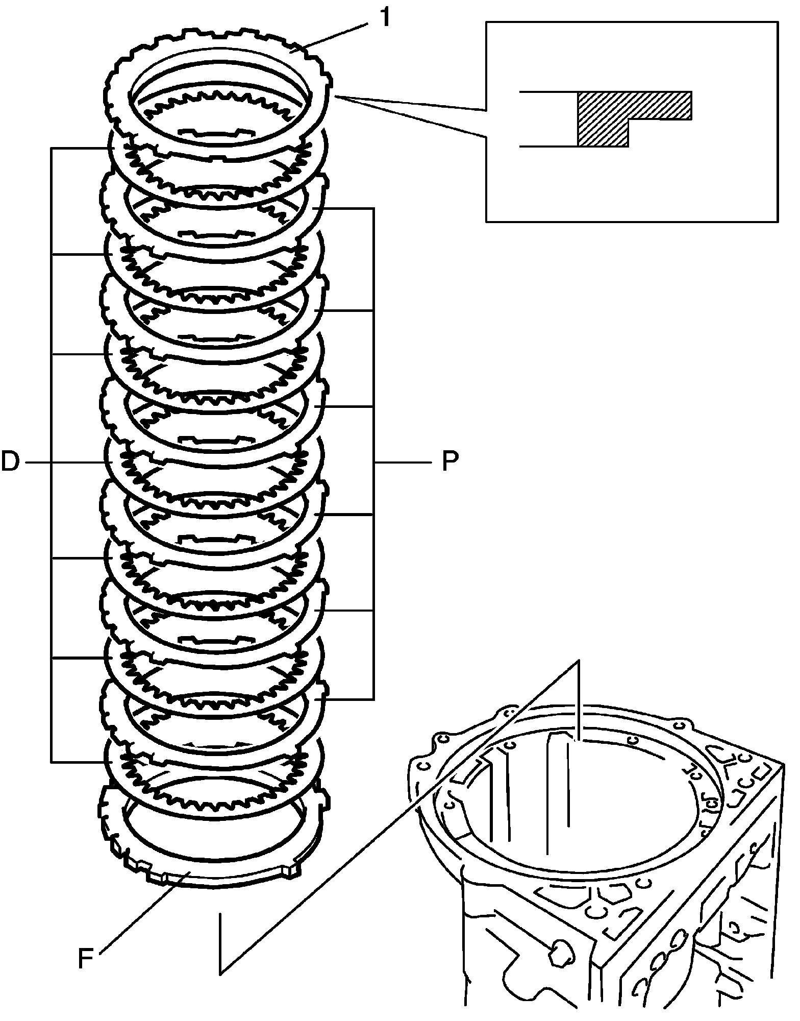 20) Install 1st & reverse (No.4) brake flange "F", 1st & reverse (No.4) brake discs "D" and 1st & reverse (No.4) brake plates "P" in the following order.