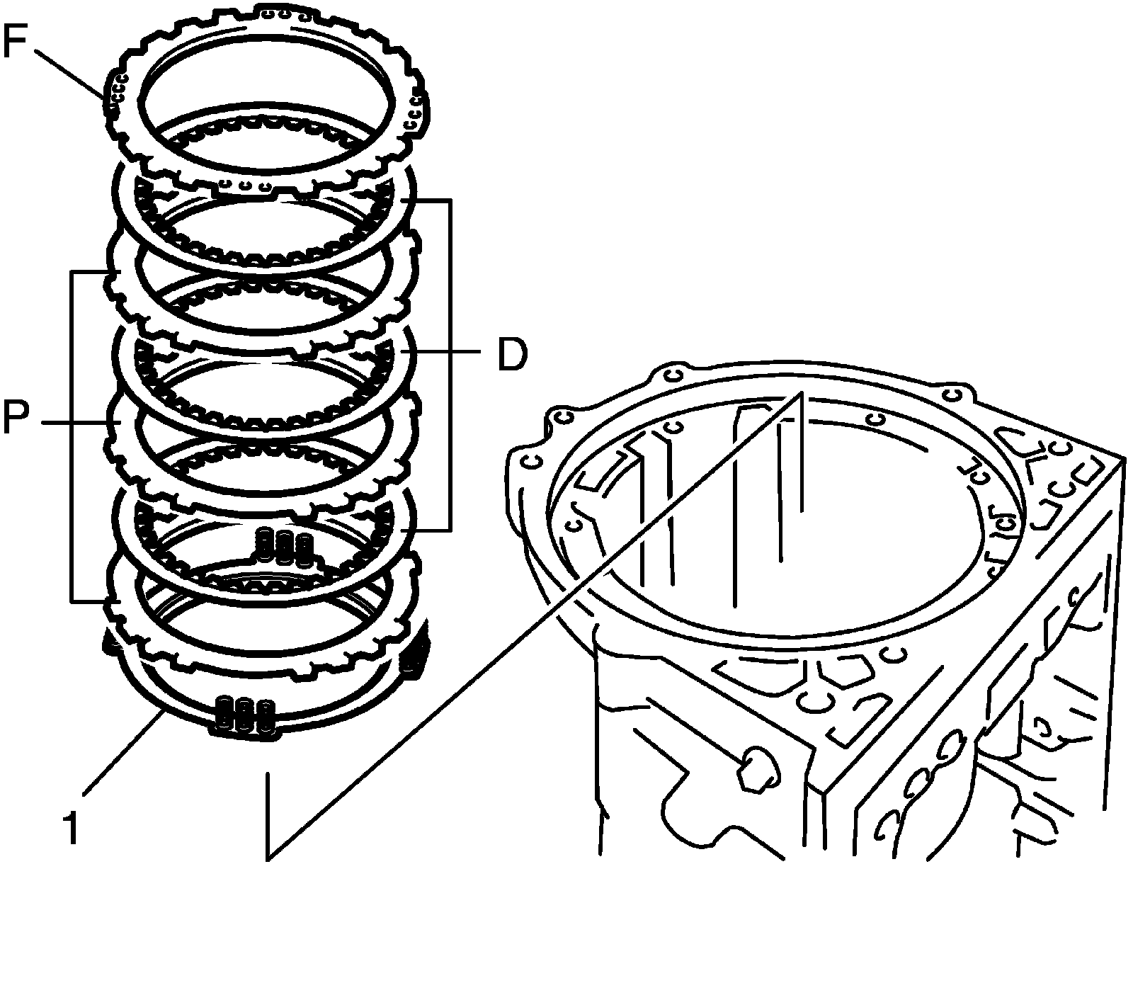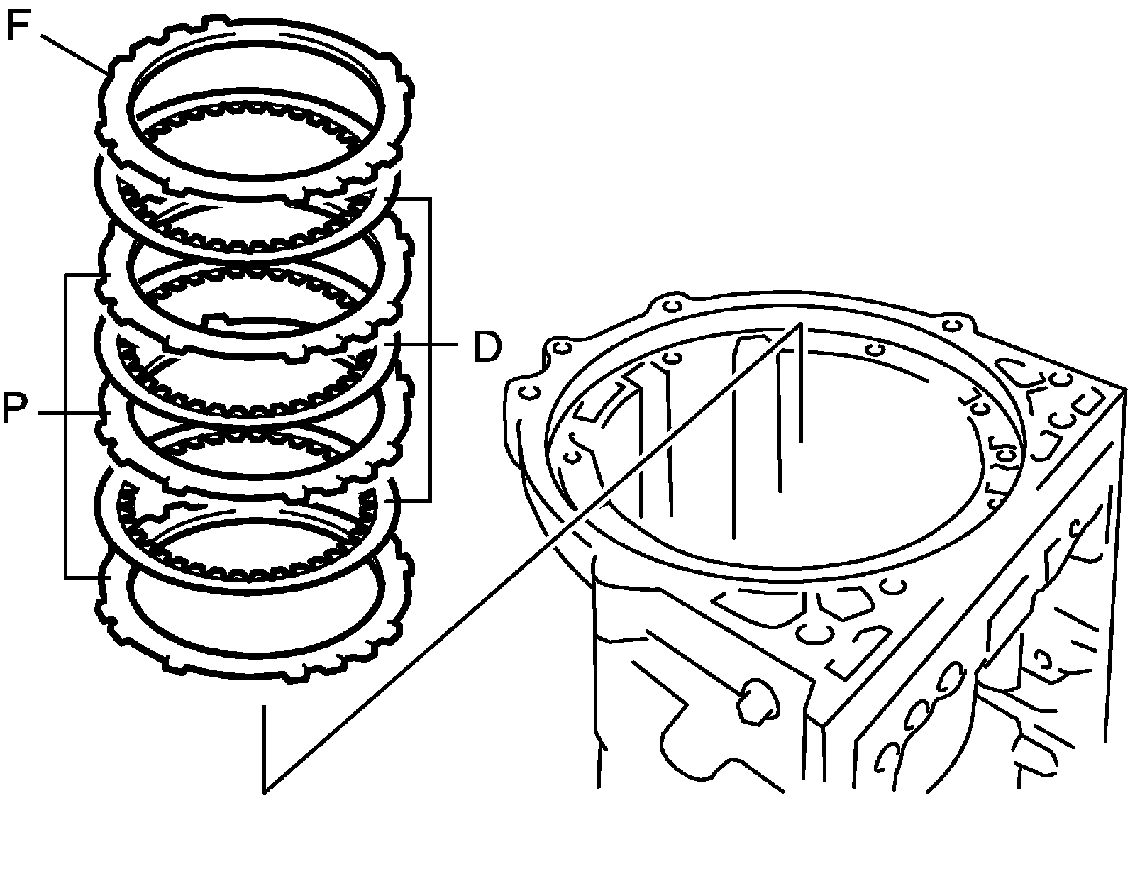 48) Install No.1 brake discs "D", No.1 brake plates "P" and No.1 brake flange "F" in the following order.