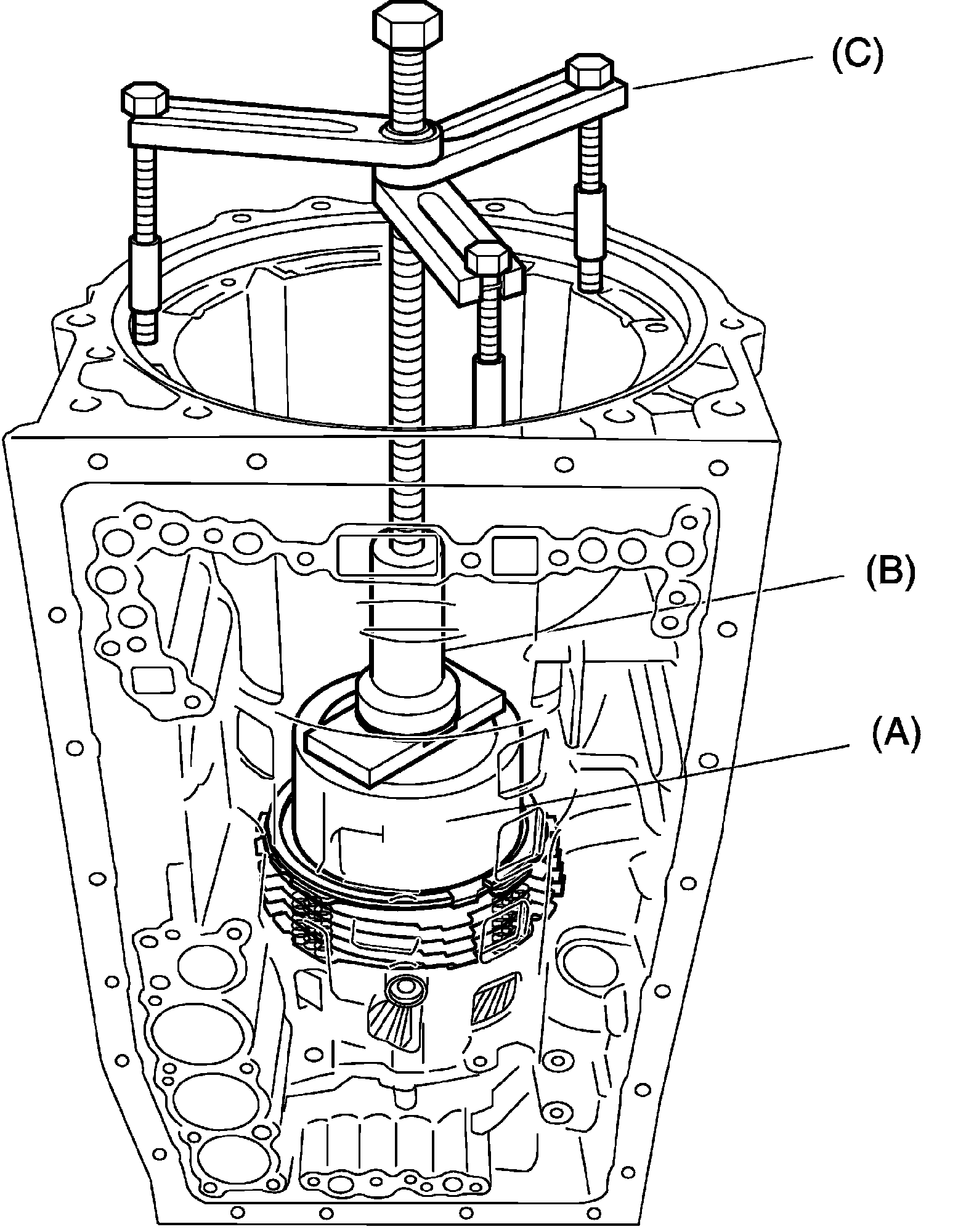 39) Compress No.1 brake piston return spring until the No.1 brake piston return spring is lowered to the place 1 - 2 mm (0.039 - 0.078 in.) from the snap ring groove by using special tool.