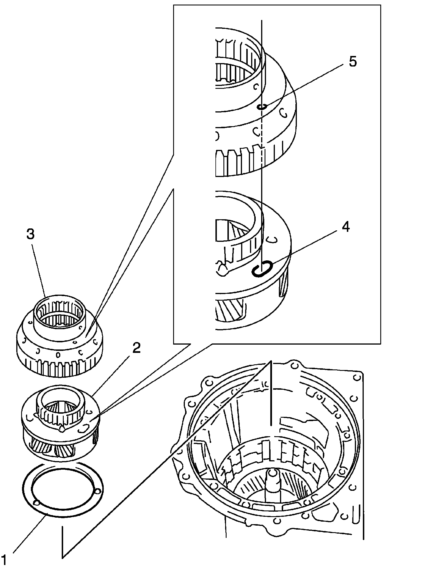 Make sure align front planetary gear assembly trenches (4) and one-way No.1 clutch inner race holes (5).