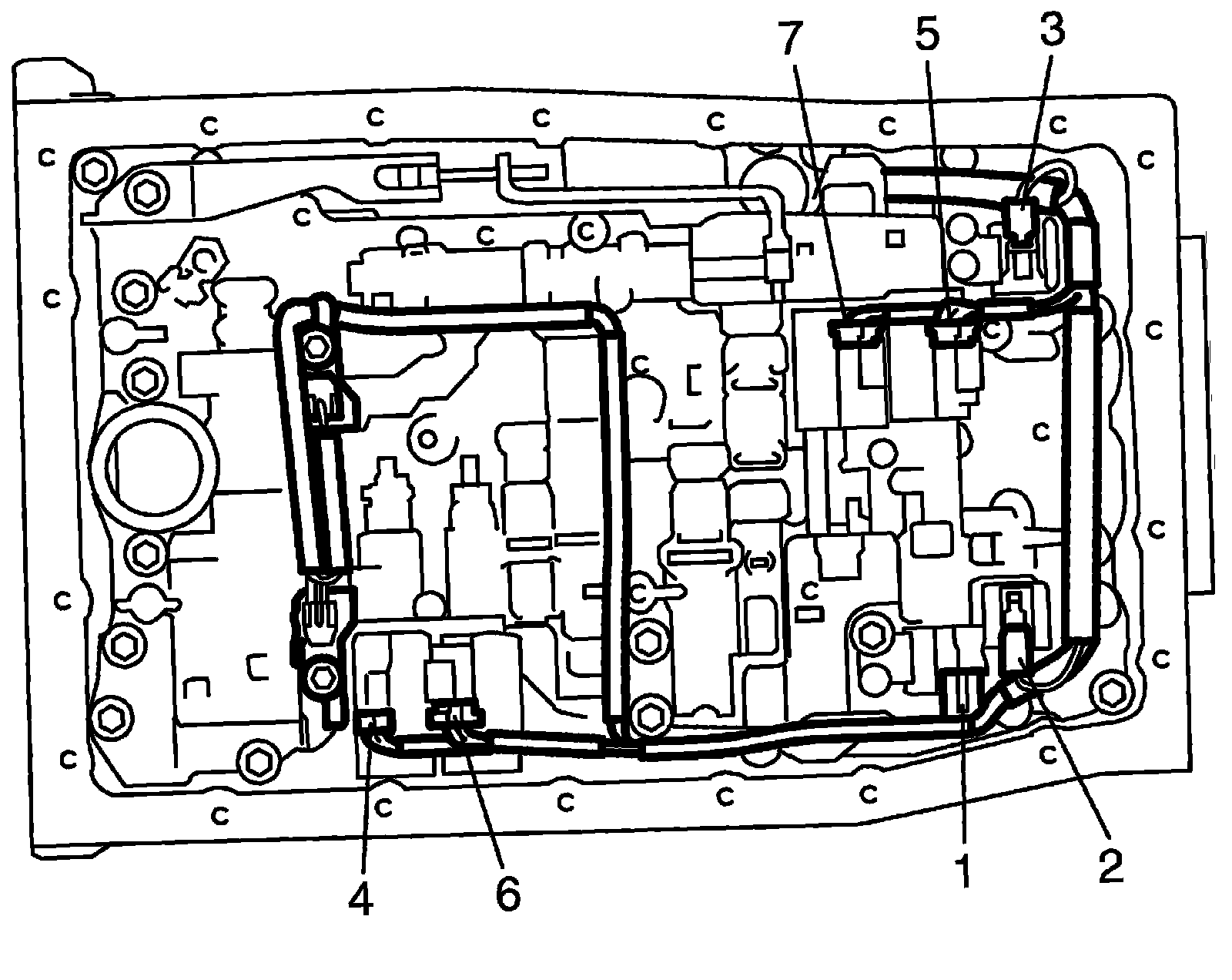 8) Disconnect shift solenoid-A connector (1), shift solenoid-B connector (2), shift solenoid-E connector (3), TCC solenoid connector (4), Pressure control solenoid-A connector (5), Pressure control solenoid-B connector (6) and Pressure control solenoid-C connector (7).