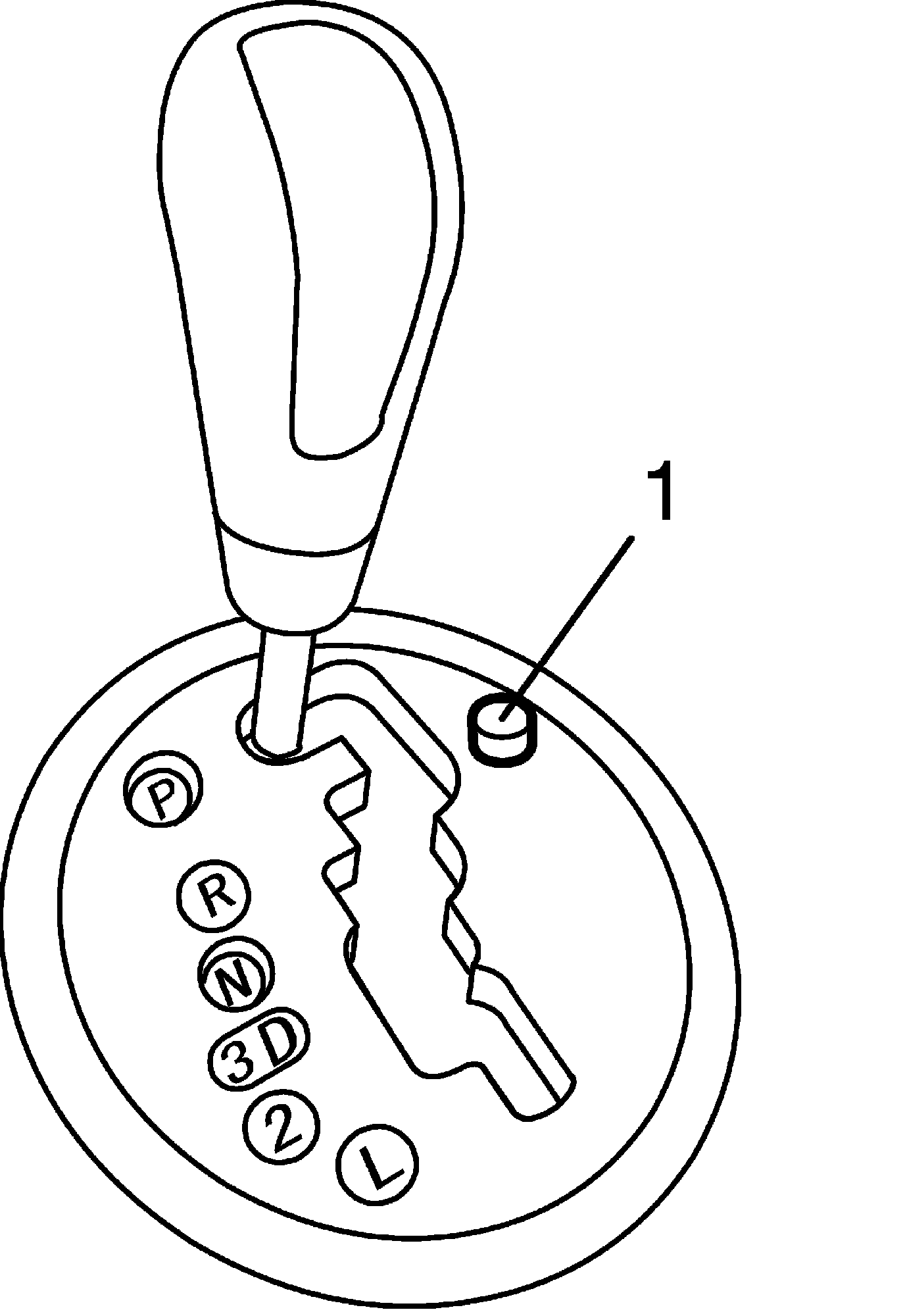^ With shift lock solenoid release button (1) pushed and ignition key turned to ACC position, selector lever can be shifted from "P" range position to any other range.