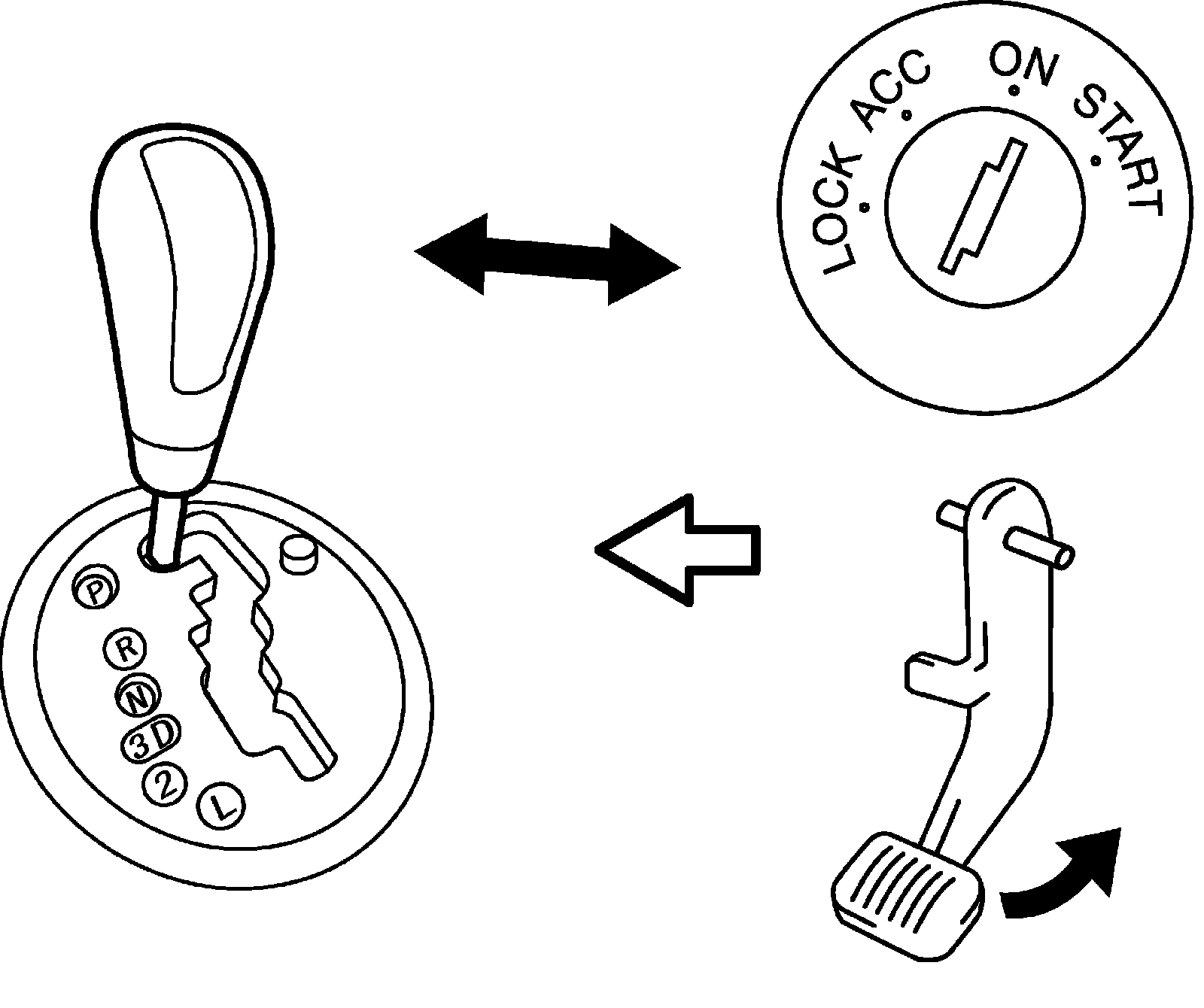 Brake and key Interlock System Inspection1) Check that selector lever cannot be moved to any other range from "P" range position when ignition switch key is at ACC position, at LOCK position or it is removed from keyhole of ignition switch, or brake pedal is not depressed.