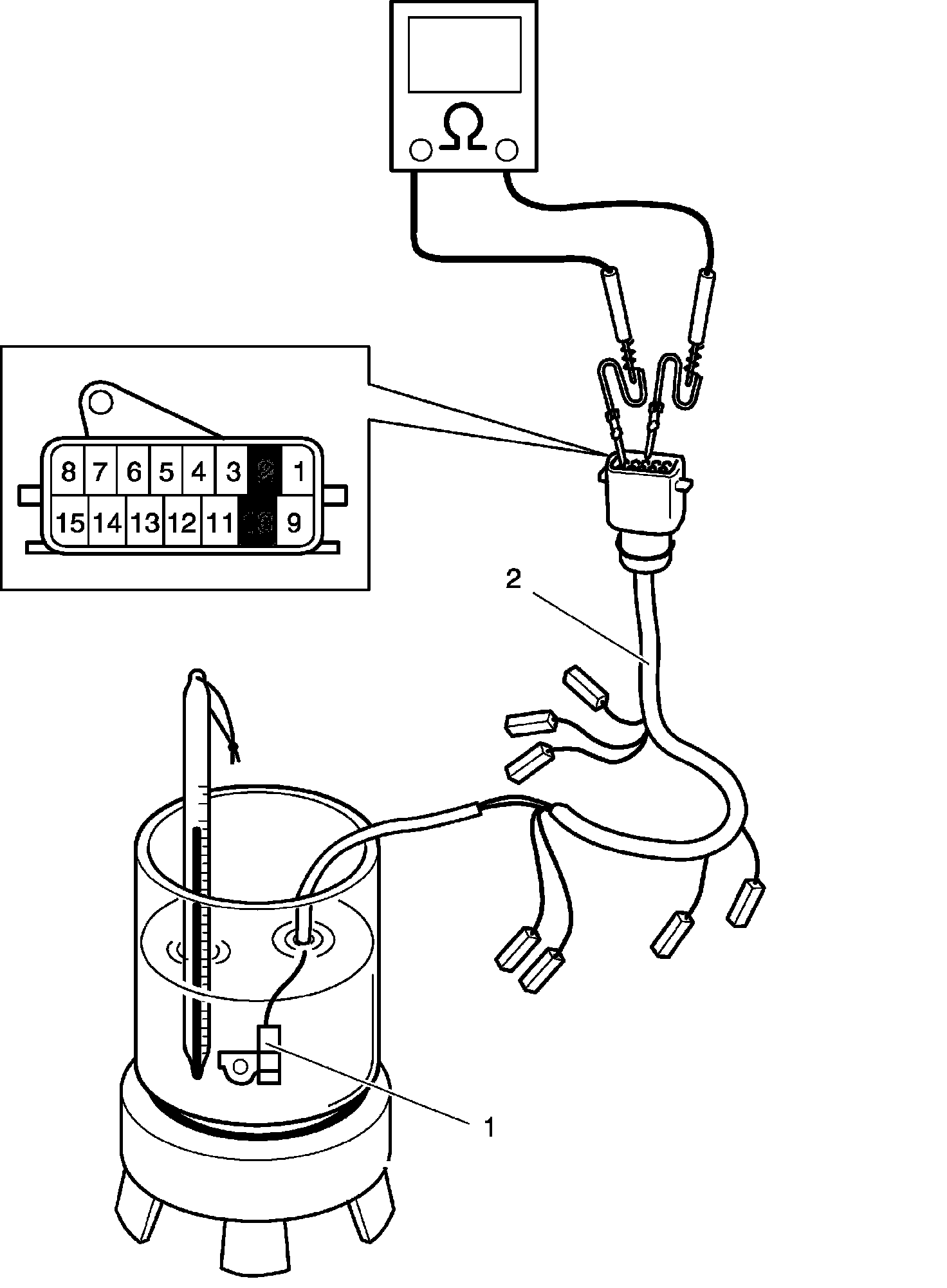 Transmission Fluid Temperature Sensor InspectionImmerse transmission fluid temperature sensor (1) in water or oil. Check transmission fluid temperature sensor resistance between terminals of connector. Thus make sure its resistance decreases as temperature rises.