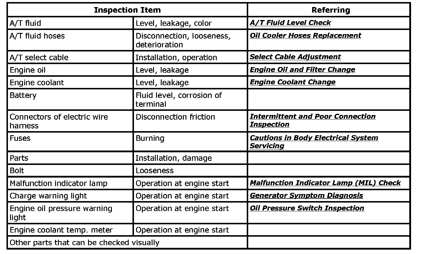 Visually check the following parts and systems.
