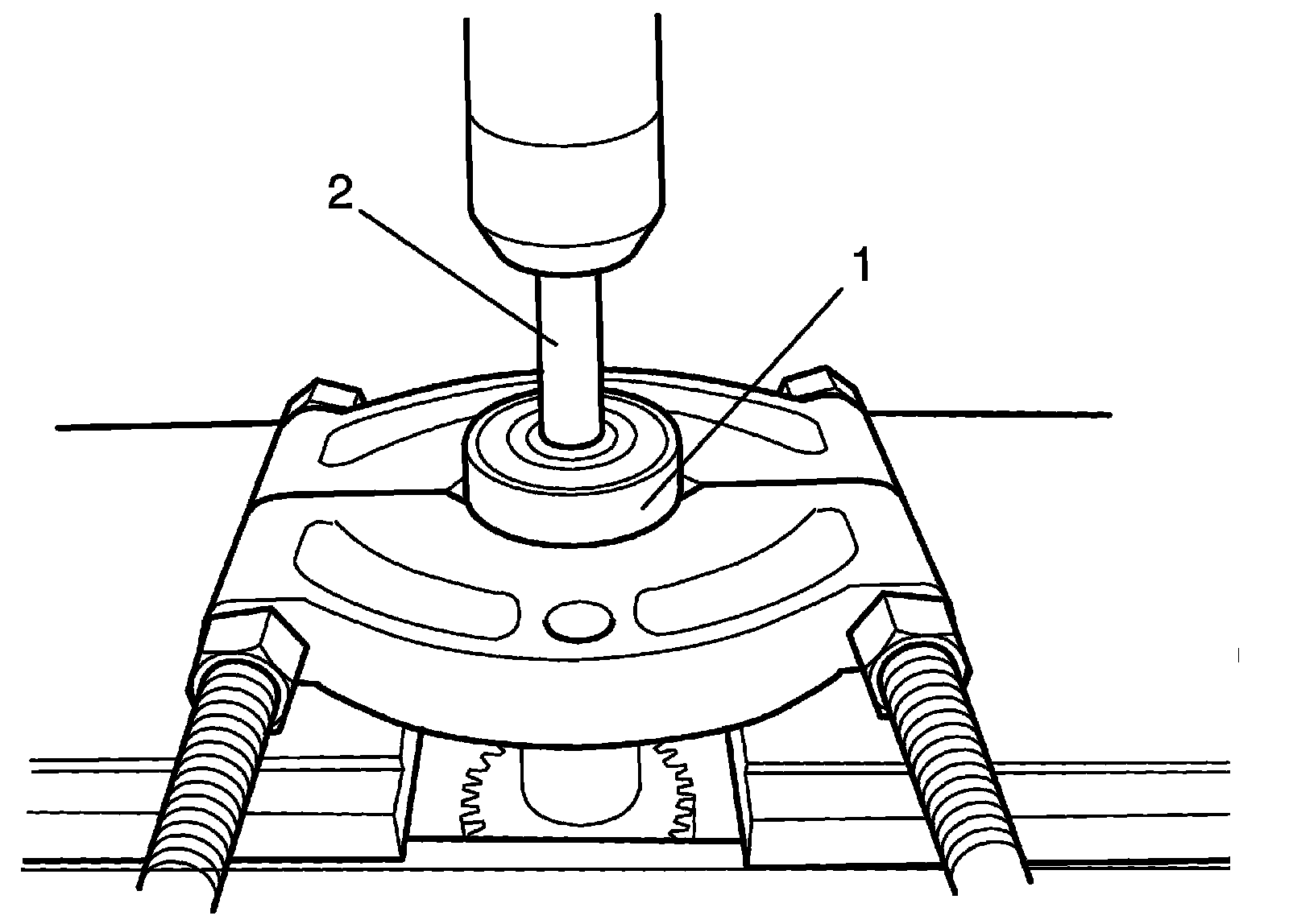 1) Remove countershaft rear bearing (1) using bearing puller, metal stick (2) and hydraulic press.