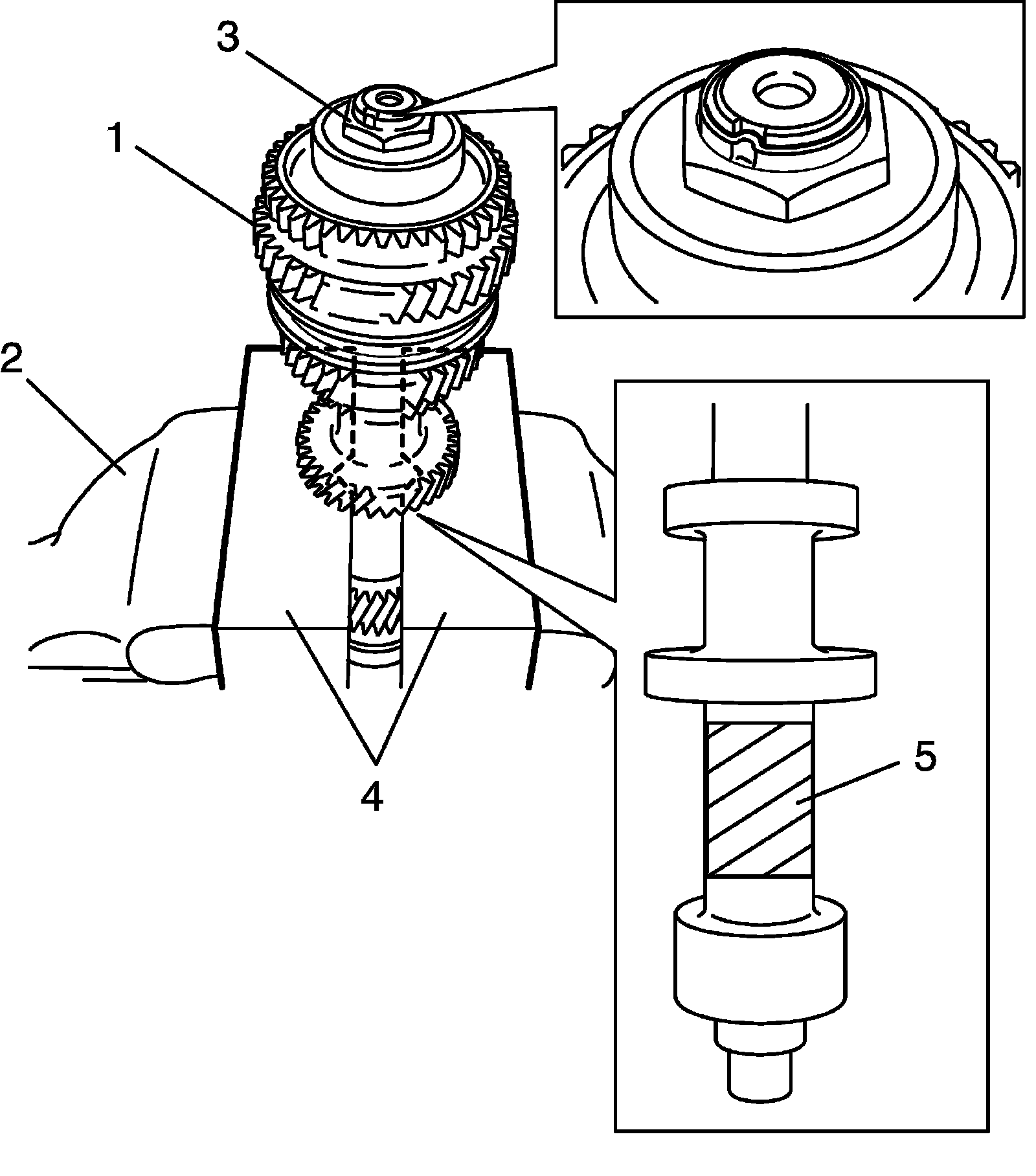 2) Hold hatched area (5) of countershaft assembly (1) with "V" blocks (4) on vise (2) or the like to stop rotation of shaft, undo caulking and countershaft front bearing nut (3).