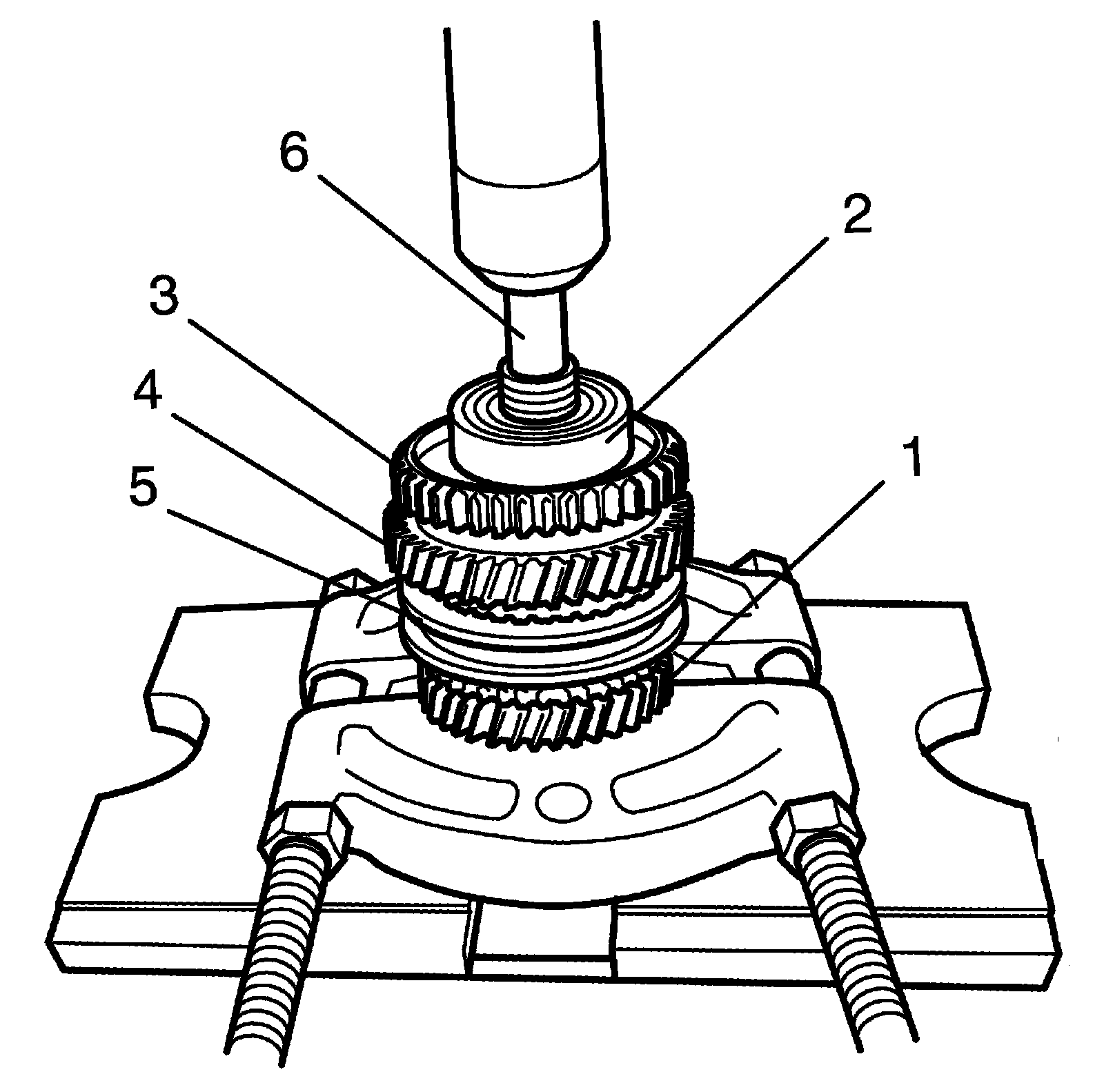3) Apply bearing puller to 2nd gear (1), and drive out countershaft front bearing (2), countershaft reverse gear (3), 1st gear (4), countershaft gear needle bearings, countershaft low needle bearing bush, low speed synchronizer assembly (5) and 2nd gear all at once from countershaft using metal stick (6) and hydraulic press.